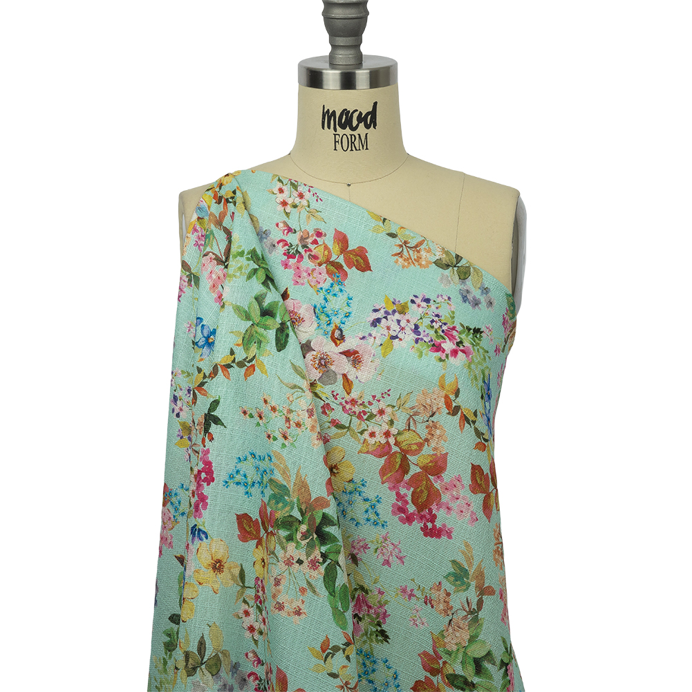 Greet the sea breeze and prepare for a new day of adventure in this Mood Exclusive Mallorcan Morning Slubbed Polyester Gauze! On an aqua blue ground, each blossom reveals a shade of pink, blue, and red more vibrant than the last, surrounded by lush leaves. A truly unique fabric, the gauze weave is imbued with an extra slubby texture, revealing a lightweight, bouncy feel and supremely breathable quality. Try beachy cover-ups, billowing blouses, or lightweight dusters and other layering pieces. Semi-sheer due to the open weave, a lining is recommended for opacity purposes in certain applications.
