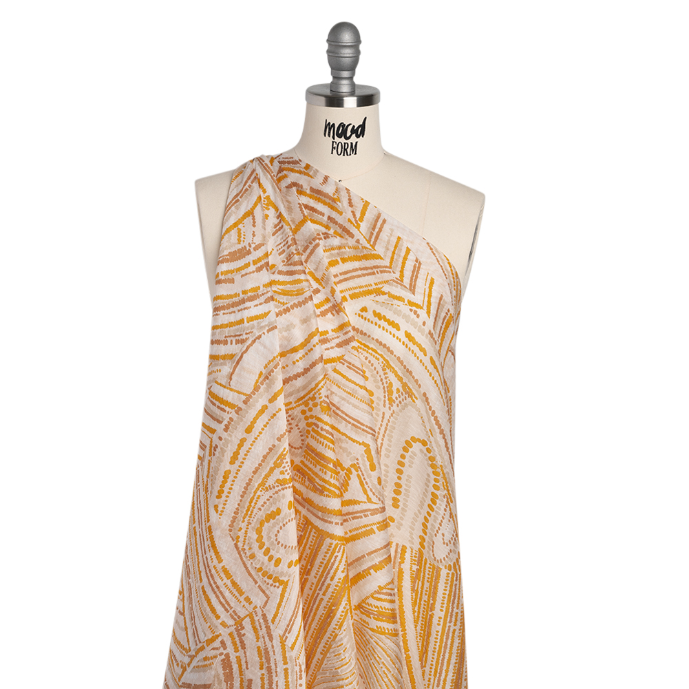 Follow this Abstract Dotted Lines Slubbed Tencel Blend Woven Print to your summery design destination—featuring a cool, slightly tactile hand and airy drape.Suggested Projects: Shirts, Pants, Skirts, DressesContent: 75% Tencel, 18% Nylon, 7% LinenStretch: NoneOpacity: TranslucentA labyrinth of dotted lines meanders across this woven fabric, sketching abstract paths in ivory, tan, and goldenrod. Crafted with recyclable solvents, this Tencel blend is as kind to the earth as it is to your skin—naturally antibacterial, refreshingly cool to the touch, and built to last. With its absorbent nature and airy drape, it’s made for effortless style under the sun: think wide-legged trousers for errands, a sweeping maxi-dress for brunch, or a playful romper for happy hour. Lightweight and translucent, it pairs well with a lining for extra coverage or structure.