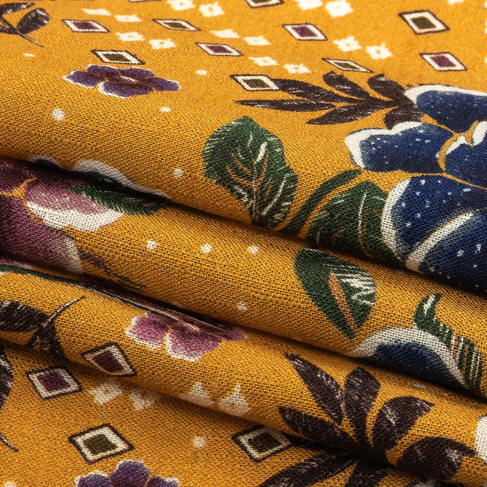 Exuding a stunningly vintage French essence, our Mood Exclusive Gamboge Melange de Fleurs Slubbed Viscose Woven derives its name from the French phrase for “mix of flowers.” This airy viscose features hand-painted floral, leaf, and diamond motifs in shades of light magenta pink, burnt orange, navy blue, and eggplant purple with soft white highlights, all of which lay elegantly across a mustard yellow-orange ground. Thin and lightweight, this slubbed fabric has an elegantly flowing drape that will provide movement and breathability in the warm summer months. With a soft, dry hand, fashion lightweight summer dresses and vibrant maxi skirts for the perfect mix of style and comfort. Notably translucent, a lining may be necessary for modesty or additional comfort.
