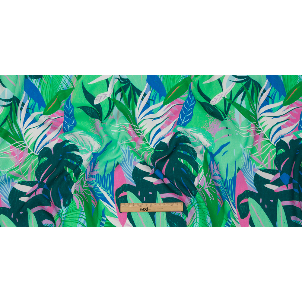 Dance the blues away with this delightful Mood Exclusive Green Tropical Tango Slubbed Viscose Woven! Color takes first place in this bold, cartoonish print of green, blue, pink, and purple leaves.