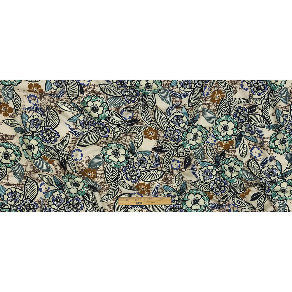 A bold floral print that demands attention, our Mood Exclusive White Blackened Buds Slubbed Viscose Woven is courageously unique! This airy viscose features a tropical floral pattern outlined in thick black strokes over a chocolate brown webbed design that resembles tie-dye. The flowers themselves are a lovely teal, turquoise blue, and deep iris purple, all of which lay over a lustrous off-white backdrop. Thin and lightweight, this slubbed fabric has an elegantly flowing drape that will provide movement and breathability in the warm summer months. With a soft, dry hand, fashion lightweight summer dresses and vibrant maxi skirts for the perfect mix of style and comfort. Notably translucent, a lining may be necessary for modesty or additional comfort.