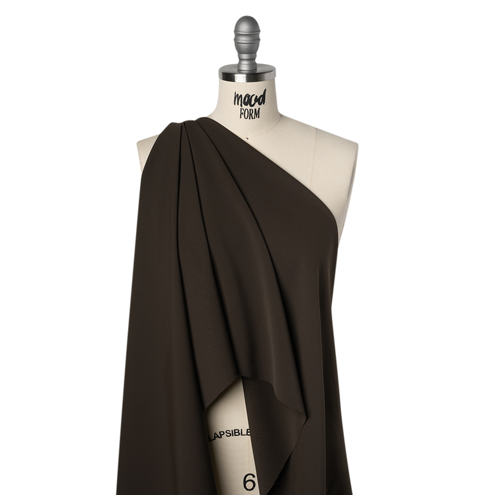 Ground your wardrobe in elemental strength with this Dark Brown Soft Lightweight Polyester Gabardine—featuring a smooth hand and fluid drape.Suggested Projects: Blouses, Suits, Skirts, DressesContent: 100% PolyesterStretch: Slight Mechanical GiveOpacity: Mostly OpaqueWater your creativity and unmatched designs will grow from this dark brown gabardine. With a slight mechanical give that adds a spring to its step, and a smooth hand with a fluid, flowing drape, this fabric longs to dance into flirty, flirtatious silhouettes. From the boardroom to the ballroom, it twirls effortlessly into simple blouses, chic skirts, stunning dresses, or coordinating suit sets that move with playful elegance. Mostly opaque, it invites a lining for a more tailored fit or layering to let its airy fluidity shine while adding just the right touch of coverage.