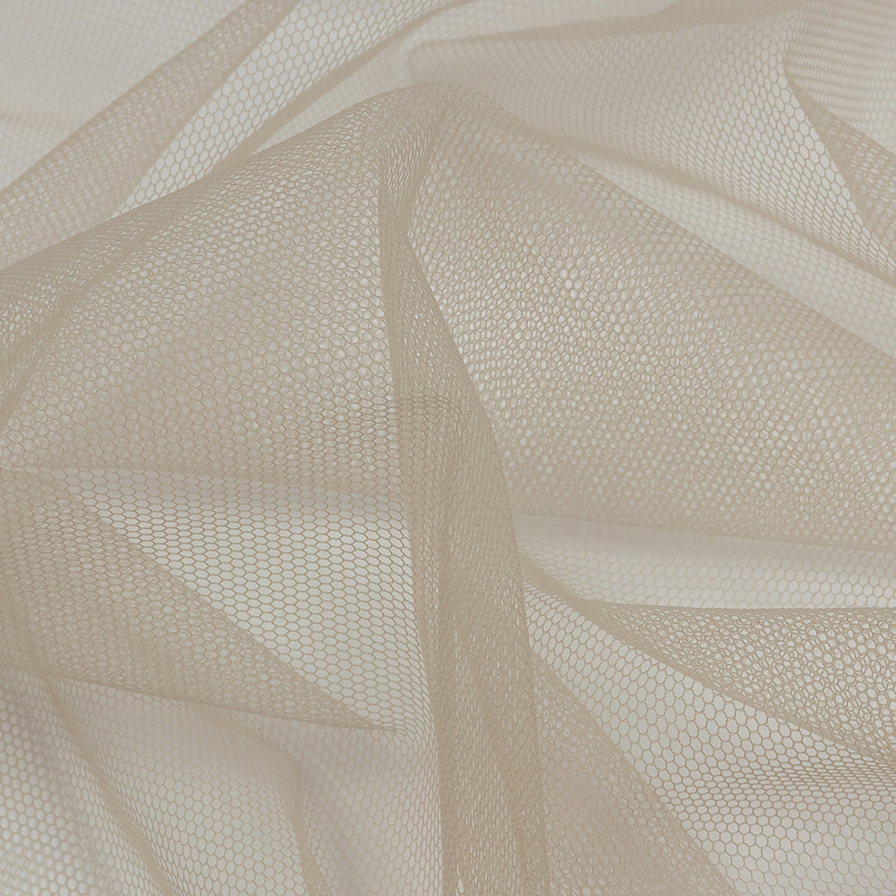 Keep the peace with this perfectly neutral Greige Soft Nylon Tulle. Featuring a lightweight feel, coarse hand, and airy drape, it’ll add otherworldly volume to your projects.Suggested Projects: Veils, Skirts, Dresses, AccentsContent: 100% NylonStretch: Mechanical GiveOpacity: TransparentThis primary greige color will inspire elegant, captivating garments. While surprisingly flowy with a lightweight feel, this fabric still boasts tulle's characteristic coarse texture and open net weave. Add layers for voluminous skirts and gowns, or use this tulle on its own to create sheer accents geared towards couture fashion and any number of costume applications such as illusion necklines. Note that this material is transparent, so if a raised opacity is desired, a lining should be considered.