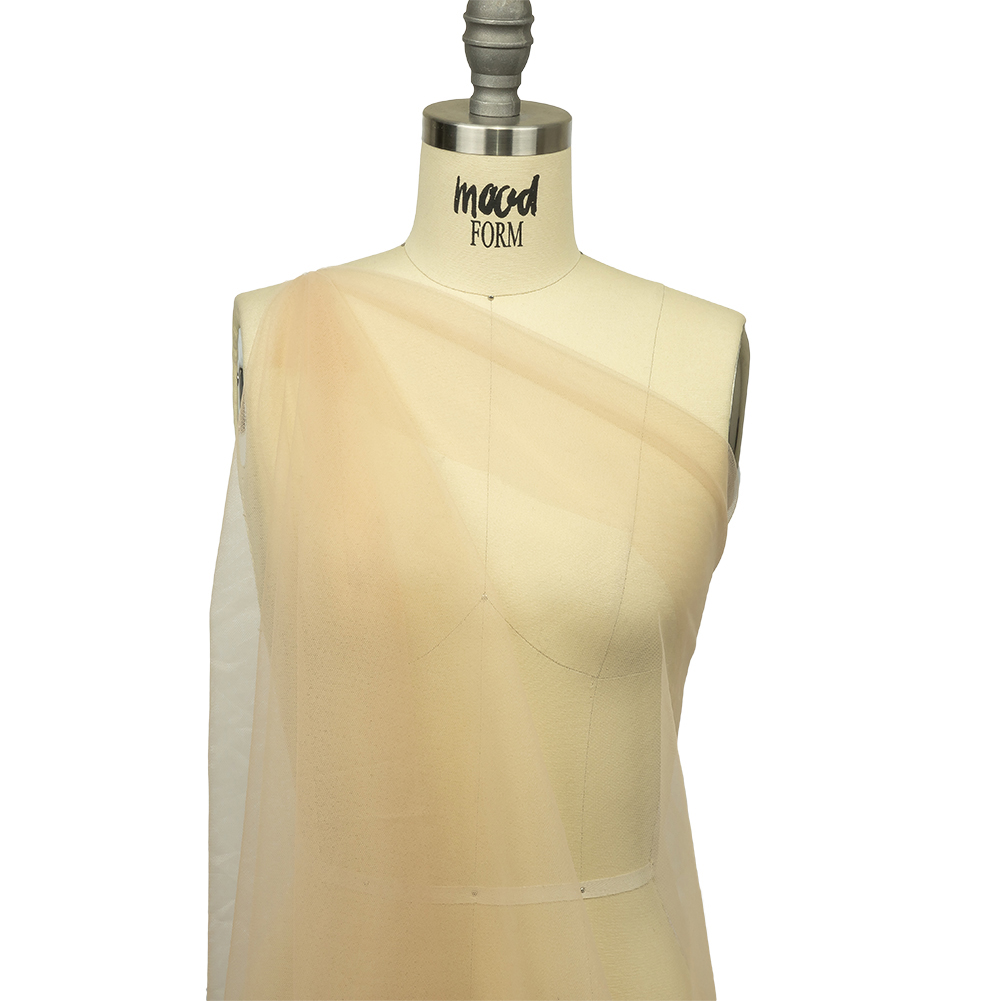 Whether sweet or salty, you’ll love our Toasted Almond Soft Nylon Tulle! Featuring a lightweight feel, coarse hand, and airy drape, it’ll add otherworldly volume to your projects.Suggested Projects: Veils, Skirts, Dresses, AccentsContent: 100% NylonStretch: Mechanical GiveOpacity: TransparentA pinkish-beige color will inspire elegant, captivating garments. While surprisingly flowy with a lightweight feel, this fabric still boasts tulle's characteristic coarse texture and open net weave. Add layers for voluminous skirts and gowns, or use this tulle on its own to create sheer accents geared towards couture fashion and any number of costume applications such as illusion necklines. Note that this material is transparent, so if a raised opacity is desired, a lining should be considered.