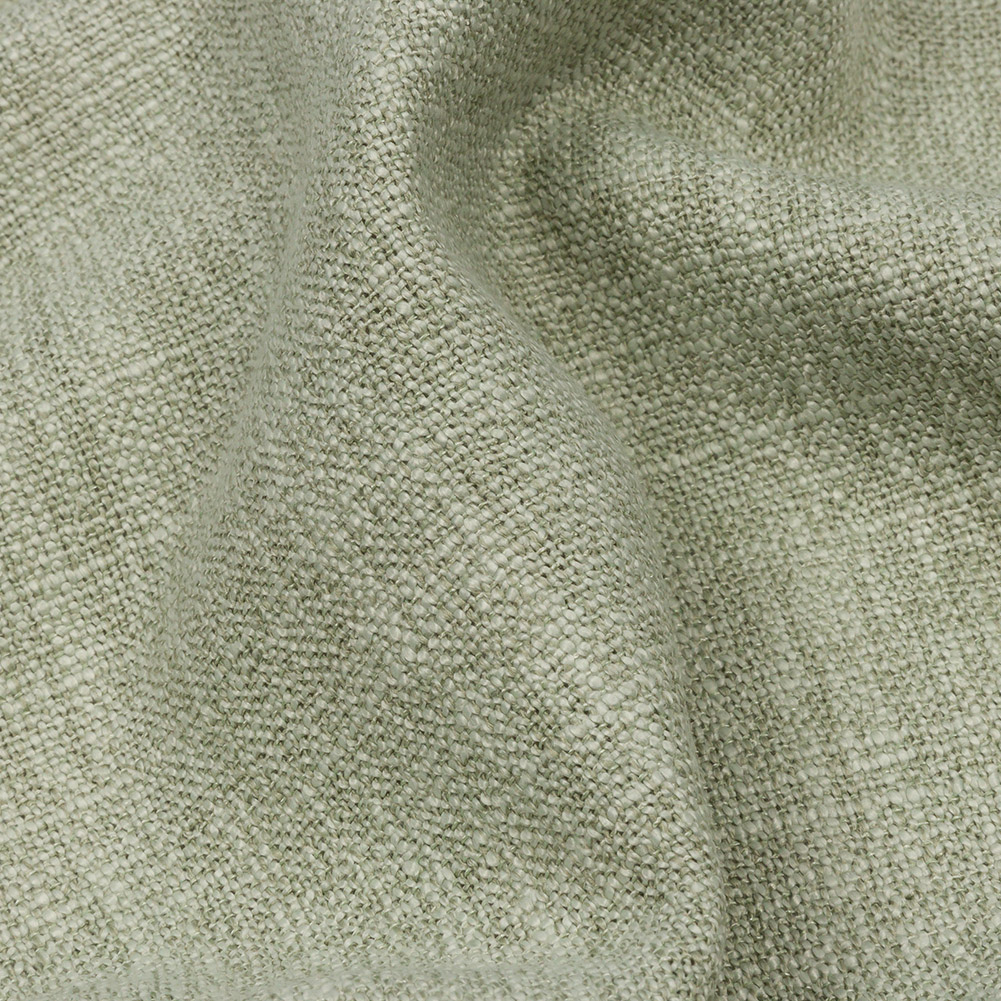 Take a crack at lush home decor projects with this British Imported Pistachio Soft Textured Recycled Polyester Drapery Woven. In a soft pale green, the weave takes on a linen-like appearance, giving it a softly slubbed hand. With an easy drape and no stretch, create dramatic drapes, pooling curtains, elegant swags, valances, or even light upholstery projects like throw pillows and upholstered headboards. Slightly translucent, a lining can be added to increase opacity.