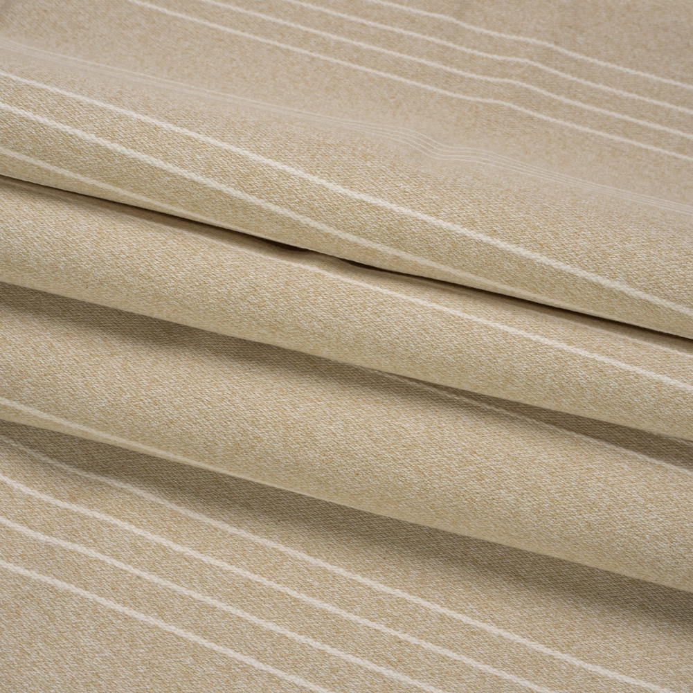 Enhance your space with this British Imported Sand Textured Stripes Cotton Blend Twill! A slightly heathered beige background hosts groups of raised white stripes running vertically. The fabric is dimensional and soft, falling with a malleable drape.Charming and timeless, stripes present you with a few design options:Layering: contrast with other patterns and colors for a curated lookStructure: bring order and refinery to your space with a simple patternRedirection: emphasize ceiling height or draw eyes to an accent piece.No matter your goal for stripes, the message is the same: simplicity is powerful! From curtains to drapes to valances (to even light upholstery projects like headboards and ottomans), enjoy this mostly opaque fabric with or without a lining.