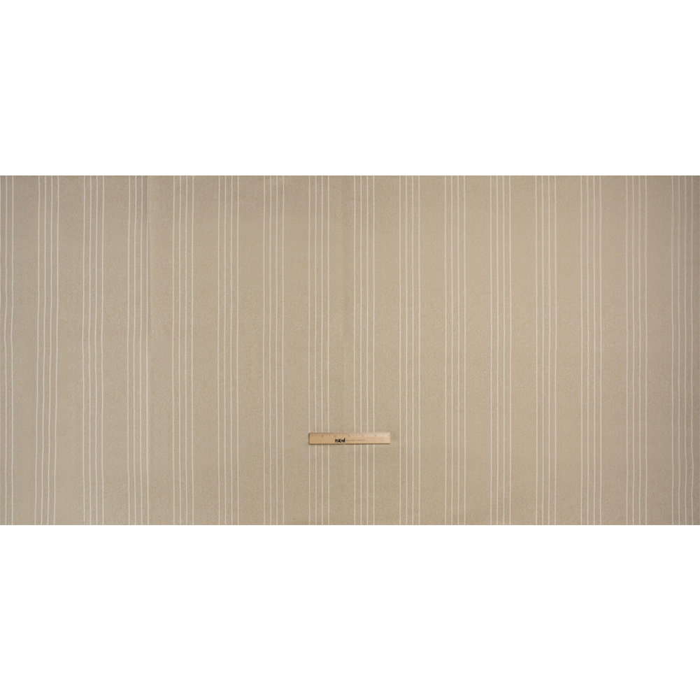 Enhance your space with this British Imported Sand Textured Stripes Cotton Blend Twill! A slightly heathered beige background hosts groups of raised white stripes running vertically.