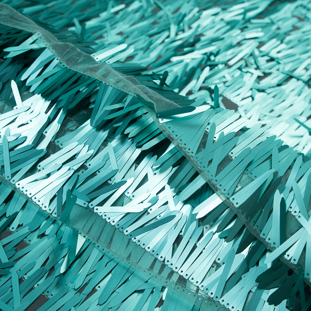 You'll be looking fresh in this Dull Mint Fringe Sequin Fabric. A soft tulle backing holds rows of luminous metallic sequin fringe ideal for a modern take on a classic look. Great for flapper dresses, costuming applications, statement jackets, and more! Given the transparent nature of the base fabric, a lining may be needed if additional structure or modesty are desired.