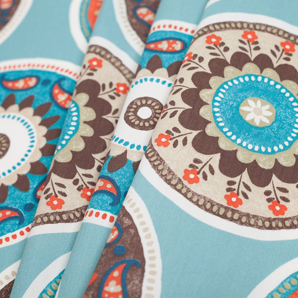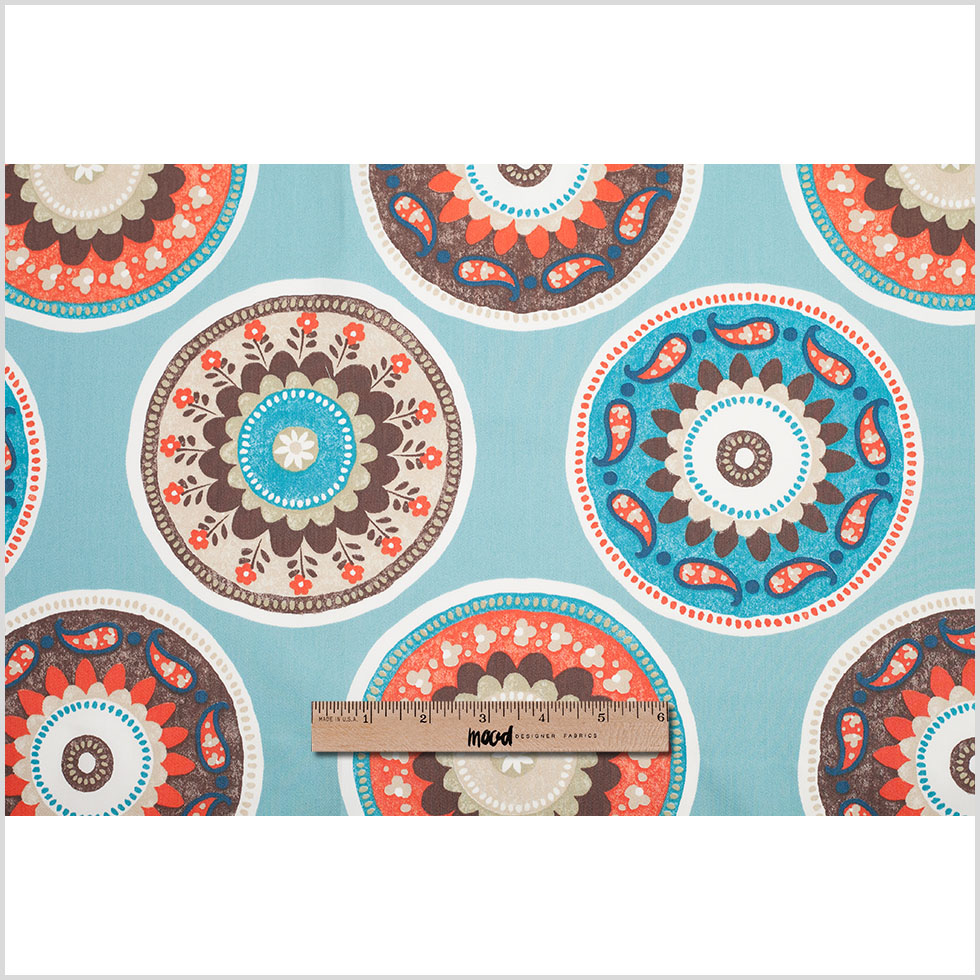 Add a Spanish flare to your home interiors with this colorful print from Spain! Aqua sea blue, tigerlily, tarragon, cocoa brown, white swan, azul blue, and white all adorn this vigorous medallion print making a bold statement for any living space. A combination of cotton and polyester makes this lighter weight woven soft and easy to maneuver. Crisp, bold, and vibrant, use this trendy material for exciting home interior decor, pillows, and drapery.