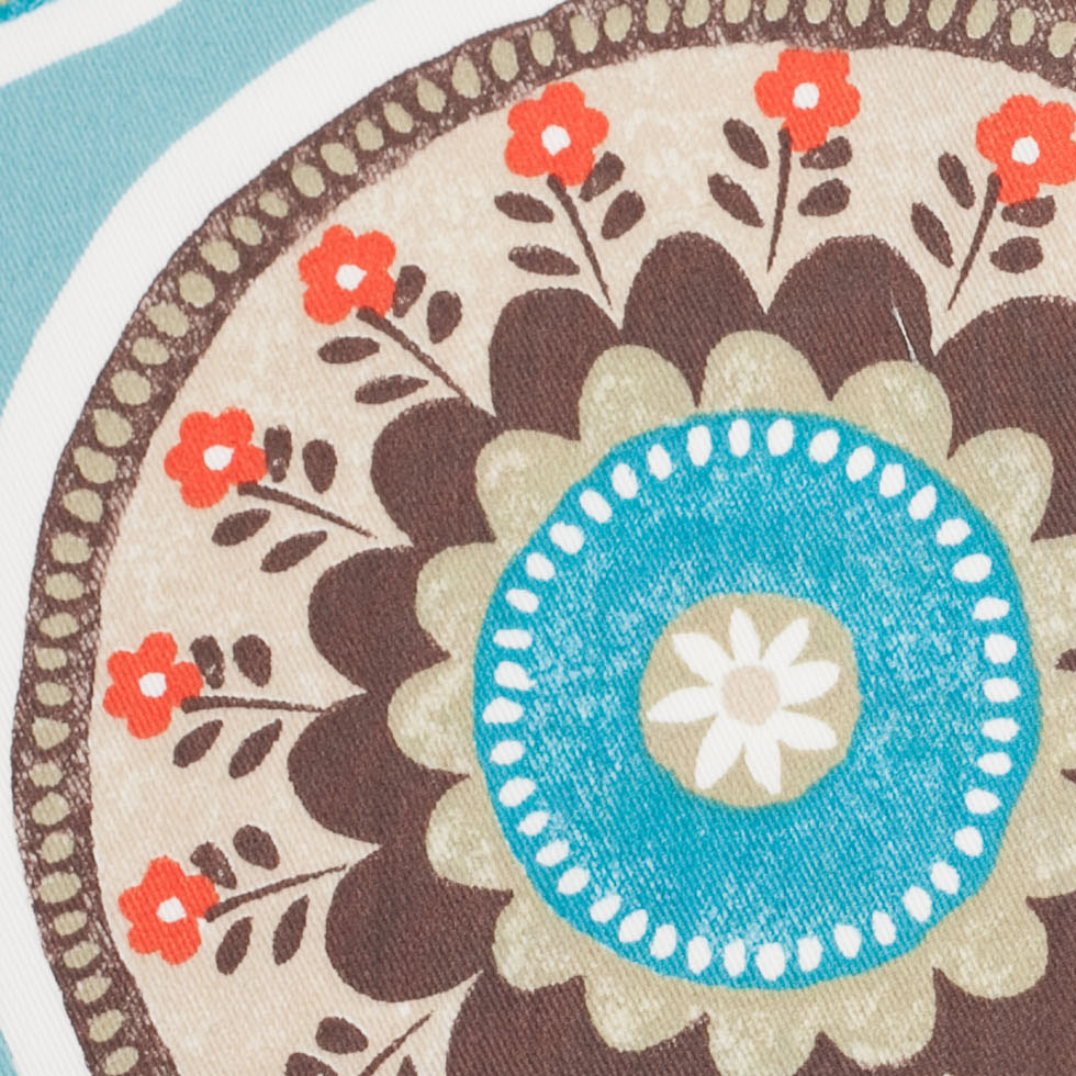 Add a Spanish flare to your home interiors with this colorful print from Spain! Aqua sea blue, tigerlily, tarragon, cocoa brown, white swan, azul blue, and white all adorn this vigorous medallion print making a bold statement for any living space.