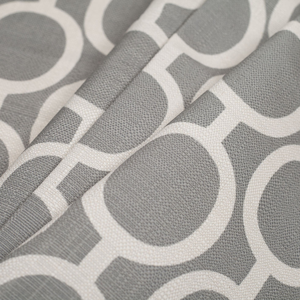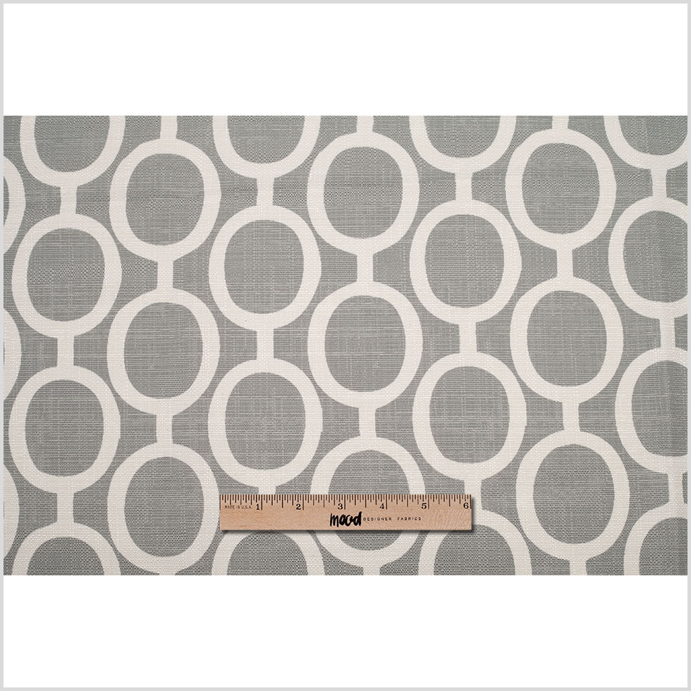 Brought to Mood from all the way from Spain, we have a fantastic, geometric, polyester/cotton canvas in a gray and white coloration. This canvas fabric contains a larger, spacious, circular print as well as a softer hand and crisper drape. With it's medium-weight and subtle luminescence, this durable home decor fabric would be perfect for upholstery as well as smaller home decor projects.