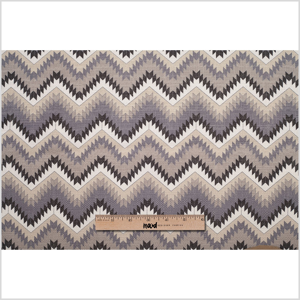 Brought to Mood from all the way from Spain, we have a fantastic, geometric, polyester/cotton canvas in a navy and beige coloration. The geometric pattern of this canvas fabric consists of a larger zig-zag pattern and smaller shapes within it similar to what you would see in a stained glass window. With it's medium-weight and subtle luminescence, this durable home decor fabric would be perfect for upholstery as well as smaller home decor projects.