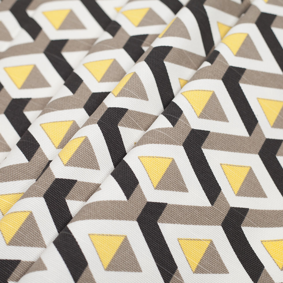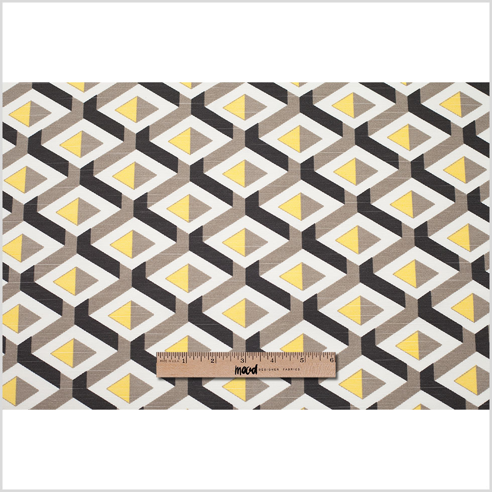 Showcasing a fascinating grouping of woven fabrics suitable for drapery, light upholstery, and home decor applications. In three different colorways, Mood presents a bold, cotton-polyester woven consisting of a geometric pattern running across the fabrics surface, as well as a slightly slubbed texture running horizontally. This material is on the lighter side of medium-weight and consists of a smoother, yet still textural surface.