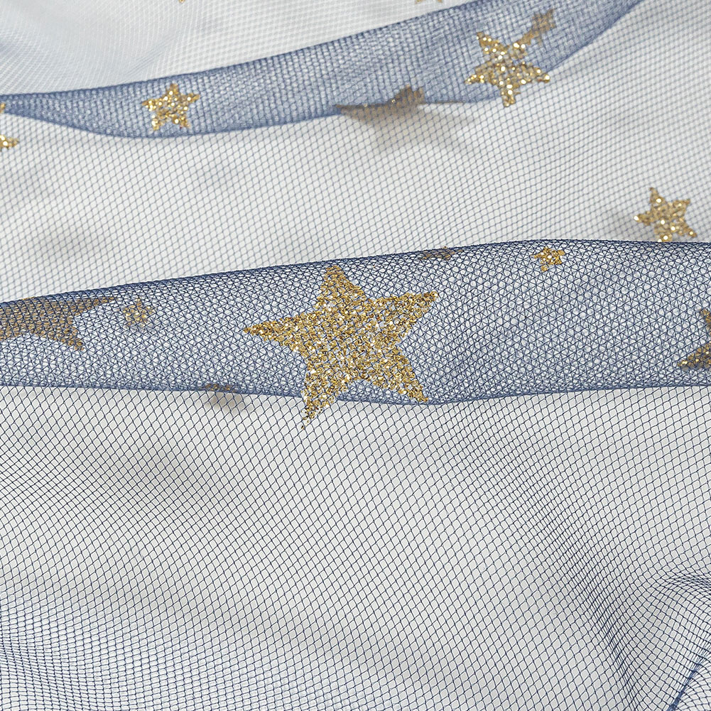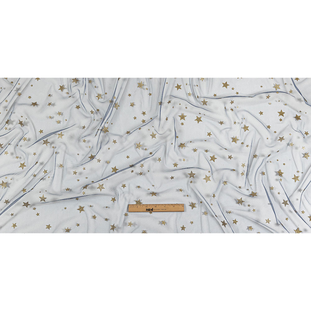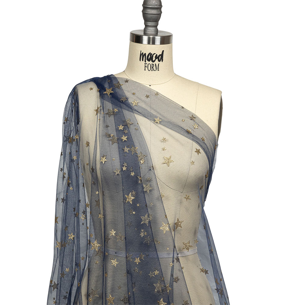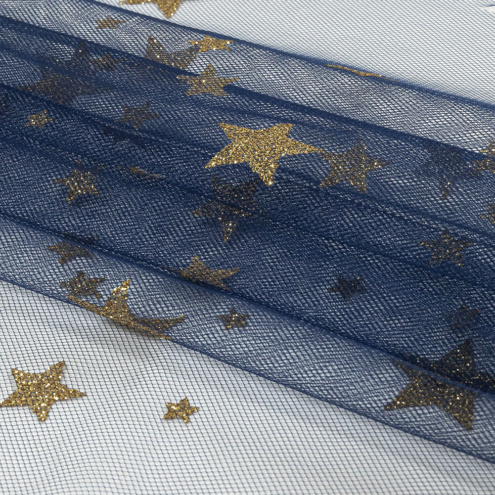All that glitters is gold on this Bright Navy Starry Glitter Tulle! Featuring a supple drape and lightly textured hand.Suggested Projects: Skirts, Dresses, Costumes, OverlaysContent: 100% NylonStretch: Slight Mechanical GiveOpacity: SheerA navy tulle, sheer and airy in construction, bears glittering gold stars scattered across its face, with a lightly textured hand and supple drape. Use the slight mechanical give to create overlays on dresses and skirts, tops with illusion necklines and extravagant puffed sleeves, or even romantic tutus. Sheer, a lining or a base layer is recommended for opacity purposes.