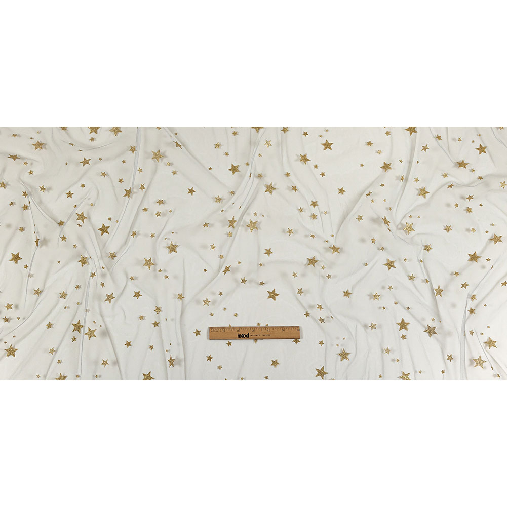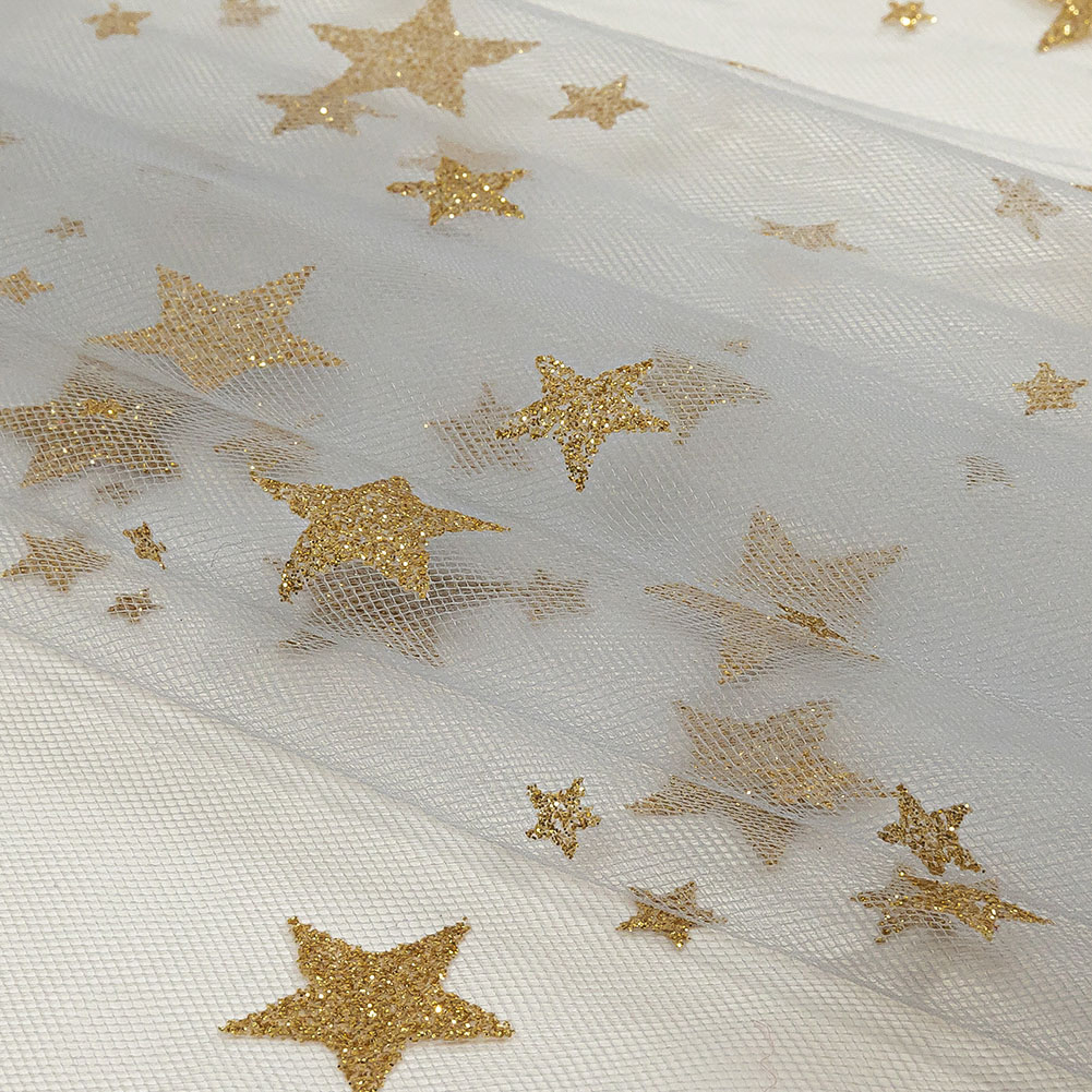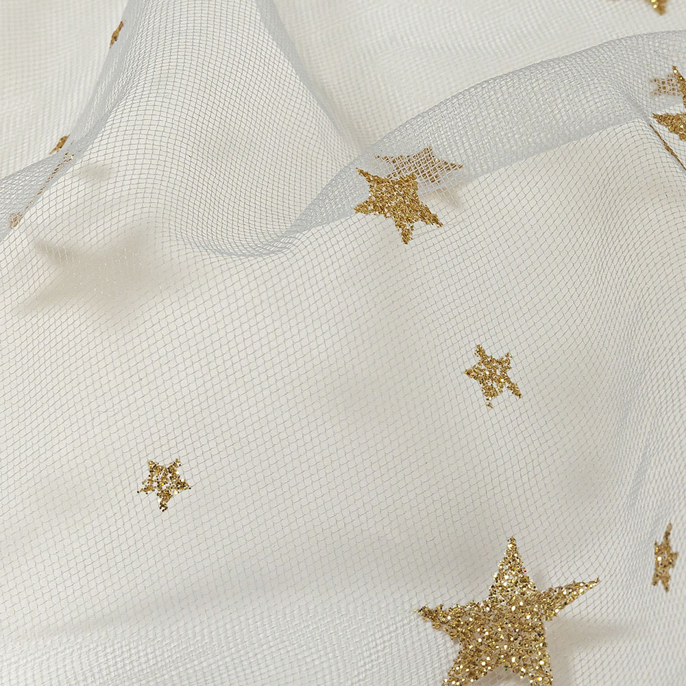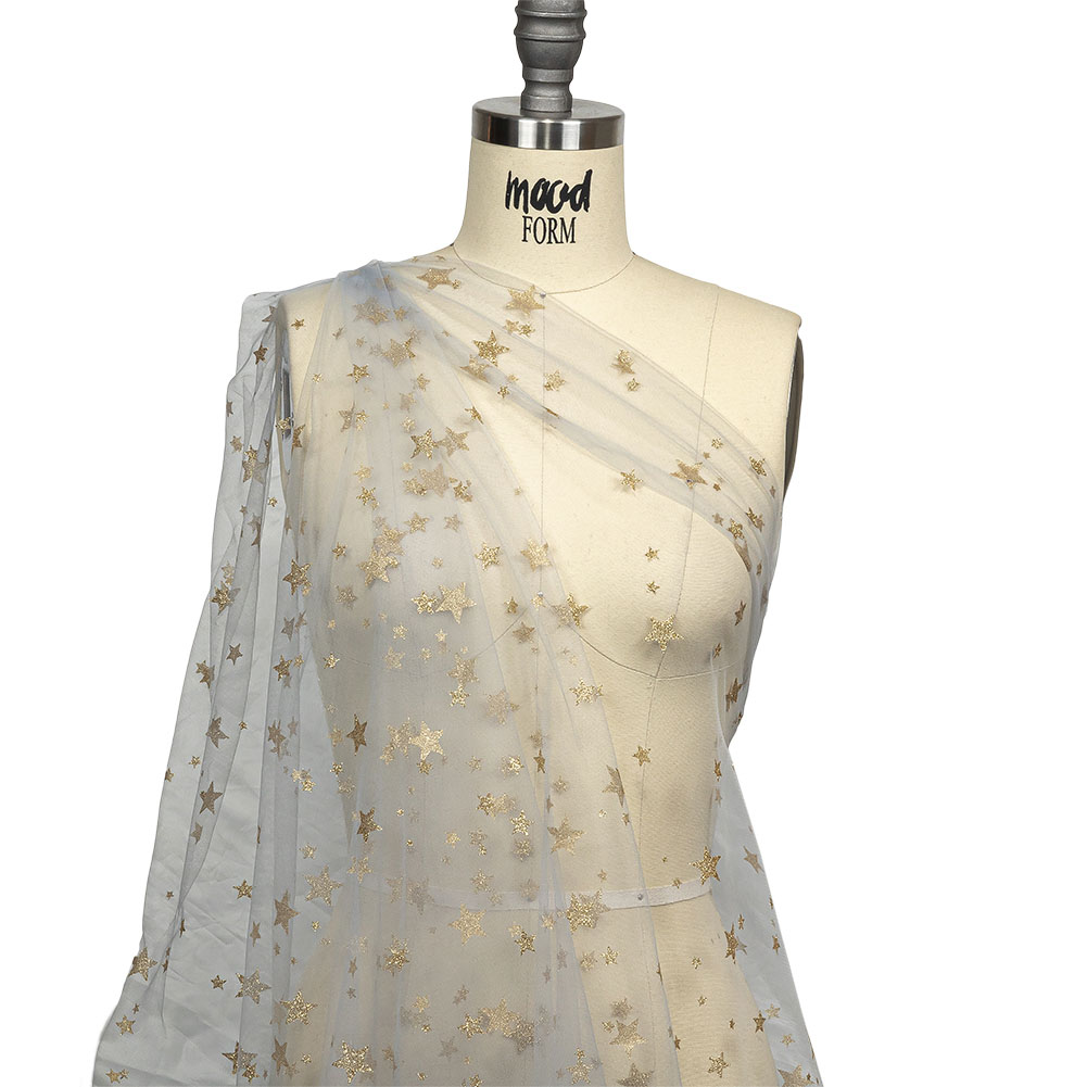 Be the ice princess you know you are inside with a little help from this Tradewinds Starry Glitter Tulle! Featuring a supple drape and lightly textured hand.Suggested Projects: Skirts, Dresses, Costumes, OverlaysContent: 100% NylonStretch: Slight Mechanical GiveOpacity: SheerA pale blue-gray tulle, sheer and airy in construction, bears glittering gold stars scattered across its face, with a lightly textured hand and supple drape. Use the slight mechanical give to create overlays on dresses and skirts, tops with illusion necklines and extravagant puffed sleeves, or even romantic tutus. Sheer, a lining or a base layer is recommended for opacity purposes.