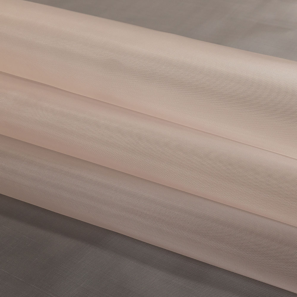 Make sure you have room in your wardrobe for our Mushroom Stiff Polyester Organdy! Seen here in a pale peach coloring, organdy is known for its stiff drape and coarse feel.