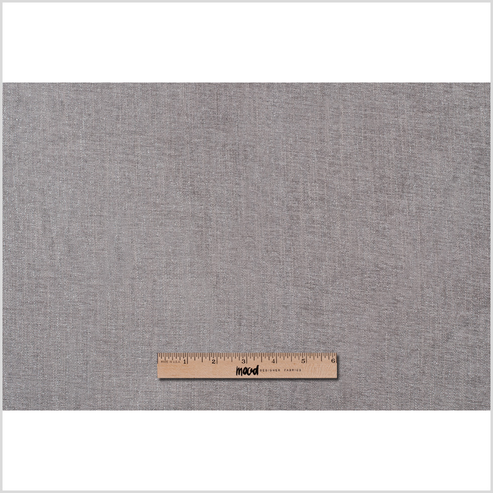 A soft, linen-like poly woven in  stone  that features a silver, sparkly effect. Medium-weight. A sophisticated addition to any room, whether as curtains, pillows or light upholstery.
