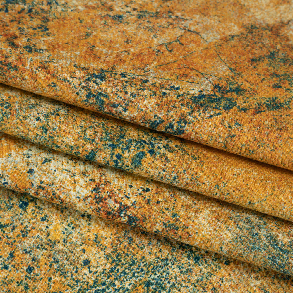 The seasons change atop this Oxidized Copper Slate Abstract Stonehenge Quilting Cotton—foliage shifting from green to orange and yellow. With a smooth hand and a supple drape, this fabric effortlessly bridges the worlds of fashion and quilting, offering both artistry and versatility for any creation.Suggested Projects: Dresses, Shirts, Jackets, Quilts, Light Home DecorContent: 100% CottonStretch: NoneOpacity: Slightly TranslucentCreate your very own abstract expressionist masterpiece with the copper orange, marigold yellow, sage green, and dark teal slate abstract design of this quilting cotton. With a smooth hand, supple drape, and no stretch, this fabric is crafted for intricate quilt work—a stable weave and silky finish are perfect for anything from classic piecework and wholecloth quilting to appliqués and art quilts to English paper piecing—yet it effortlessly lends itself to lightweight home décor, craft, and fashion projects, too.Whether you’re designing breezy shift dresses, gathered patchwork skirts, or crisp button-downs and shorts, this fabric brings a touch of elegance to every stitch—or dream bigger with flowing floor-length gowns or sharply tailored jackets and trousers, perfect for an evening out. Slightly translucent, a lining is recommended for added opacity and a refined finish.