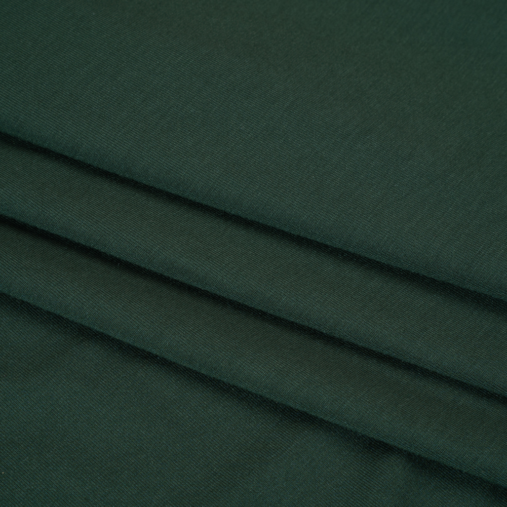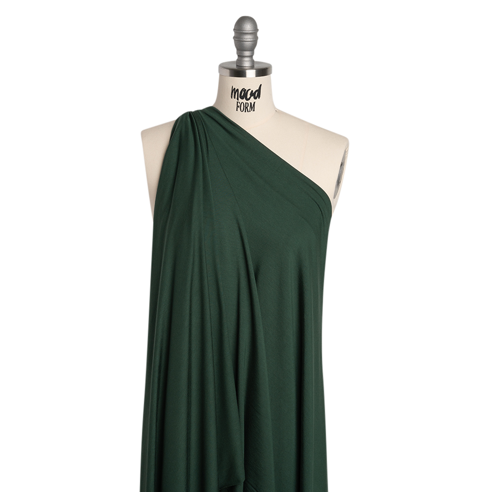 The untamed essence of hiking trails and crisp forest air unfurls atop this Forest Stretch Bamboo Jersey—featuring a soft hand and fluid drape.Suggested Projects: T-Shirts, Tank Tops, Skirts, DressesContent: 95% Bamboo, 5% SpandexStretch: 75% All-WayOpacity: OpaqueWhether you're lounging at home or running errands, this forest green bamboo jersey is the perfect companion for your day. It's incredible softness and lightweight feel make it ideal for everyday wear. Once you touch it, you’ll never want to take it off! With a 75% all-way stretch, soft hand, and fluid drape, it effortlessly inspires everything from simple tees and tanks to flattering fit-and-flare dresses. Opaque and versatile, a lining isn’t needed for most projects.Please Note: The dye lot of this fabric has changed as of November 2025. If you had previously ordered this material, please order a swatch to ensure the new dye lot meets your color requirements.