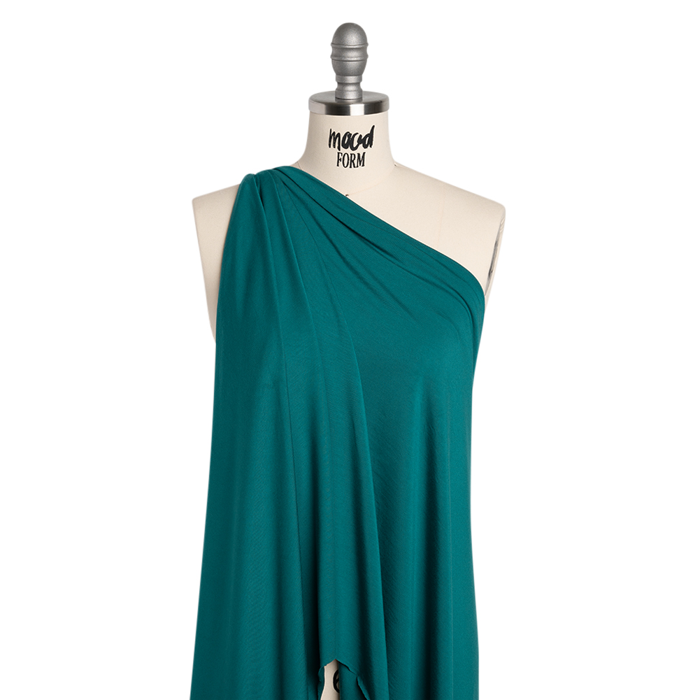 The waters of this Teal Stretch Bamboo Jersey invite you into their embrace—featuring a soft hand and fluid drape.Suggested Projects: T-Shirts, Tank Tops, Skirts, DressesContent: 95% Bamboo, 5% SpandexStretch: 75% All-WayOpacity: OpaqueWhether you're lounging at home or running errands, this teal bamboo jersey is the perfect companion for your day. It's incredible softness and lightweight feel make it ideal for everyday wear. Once you touch it, you’ll never want to take it off! With a 75% all-way stretch, soft hand, and fluid drape, it effortlessly inspires everything from simple tees and tanks to flattering fit-and-flare dresses. Opaque and versatile, a lining isn’t needed for most projects.
