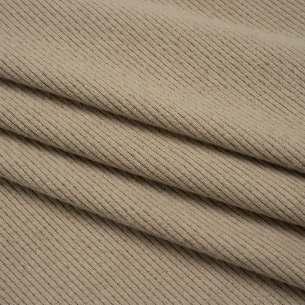 This Taupe Stretch Brushed Double-Faced 2x2 Rib Knit is sure to make taupe of the line designs—featuring a soft, fuzzy hand and supple, flexible drape.Suggested Projects: Cardigans, Tops, Skirts, LoungewearContent: 49% Polyester, 37% Cotton, 11% Viscose, 3% SpandexStretch: 75% Weftwise, 20% WarpwiseOpacity: Slightly TranslucentNothing tops the feel and flow of this taupe rib knit. A fine ribbed texture meets a brushed finish on both sides, creating a luxuriously fuzzy hand that calls for cozy, comforting designs. With a supple, flexible drape and 75% stretch through the weft (plus a little extra through the warp), this knit transforms effortlessly into body-hugging dresses, sleek turtlenecks, wrap skirts, and the softest loungewear sets—perfect for crisp autumn days and candlelit nights in. Slightly translucent, we recommend layering for a more opaque, full-bodied finish.