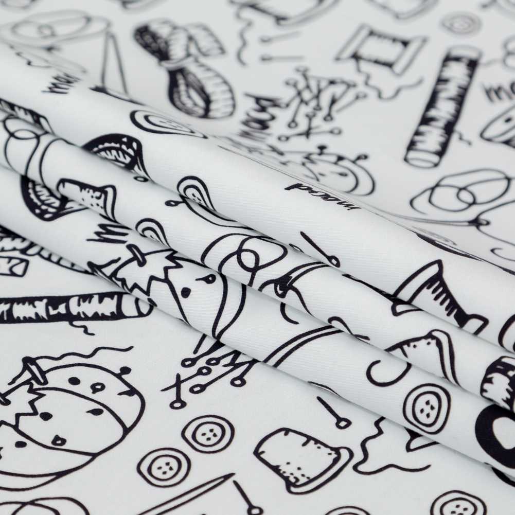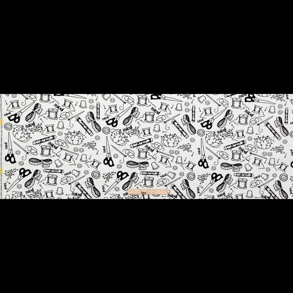Stretch Carbon Brush Twill – White and Black Sewing Supplies – Sewing Knick Knacks Print – Mood Exclusive Haberdashery Collection