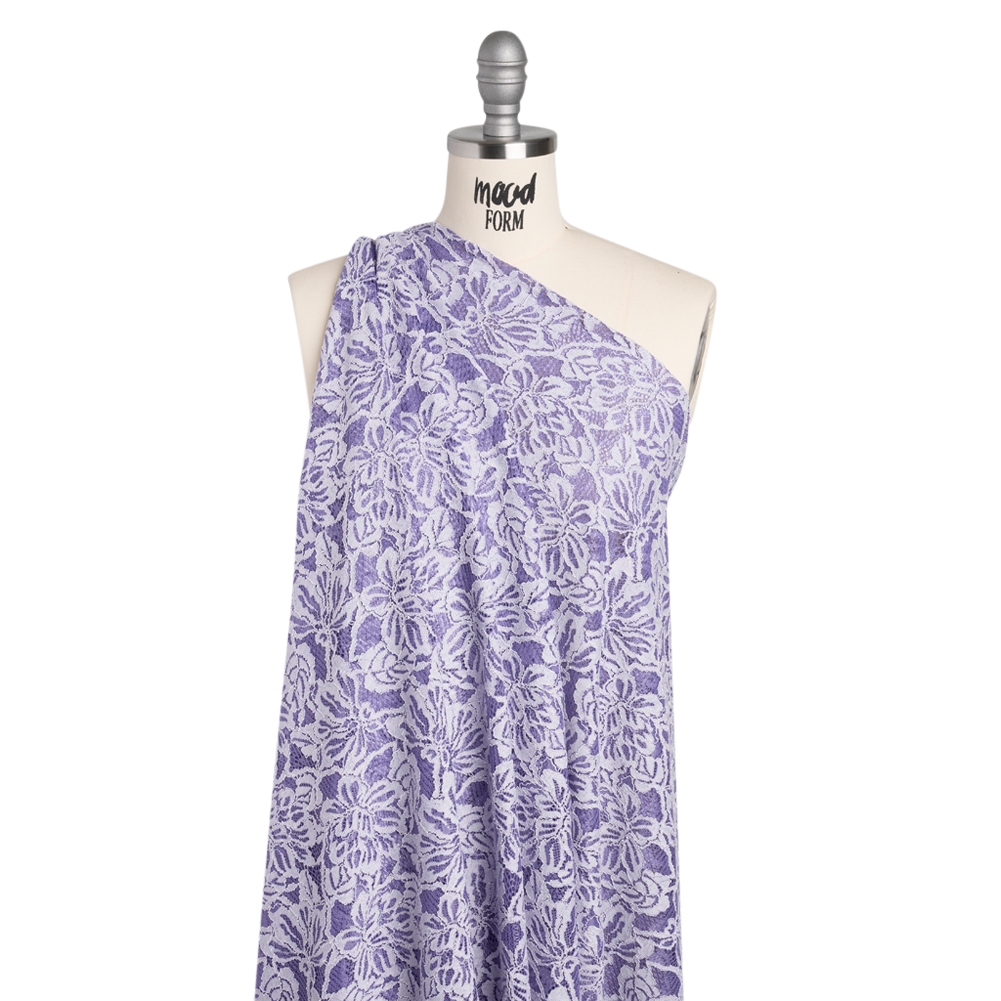 Your purple passion will burst at the seams of this Purple Corallites and Natural Tropical Blossoms Stretch Corded Lace with Finished Edges—featuring a soft, tactile hand and flexible drape.Suggested Projects: Blouses, Skirts, Dresses, LingerieContent: 40% Nylon, 34% Cotton, 21% Rayon, 5% SpandexStretch: 25% WarpwiseOpacity: SheerIn a dark lavender and natural white hue, tropical flowers bloom across this corded lace panel, complete with finished edges. This particular fabric has a soft yet tactile hand—thanks to the thin white cords running over the design—and features a fluid and flexible drape. With a slight stretch through the warp, this lace lends itself wonderfully to bodycon and loose, flowing silhouettes alike. Use it to create elegant gowns with long trains, mock-collar blouses, flowing skirts, or some lavish lingerie. Due to the nature of lace, some portions of this fabric are open so a lining may be desired for opacity.
