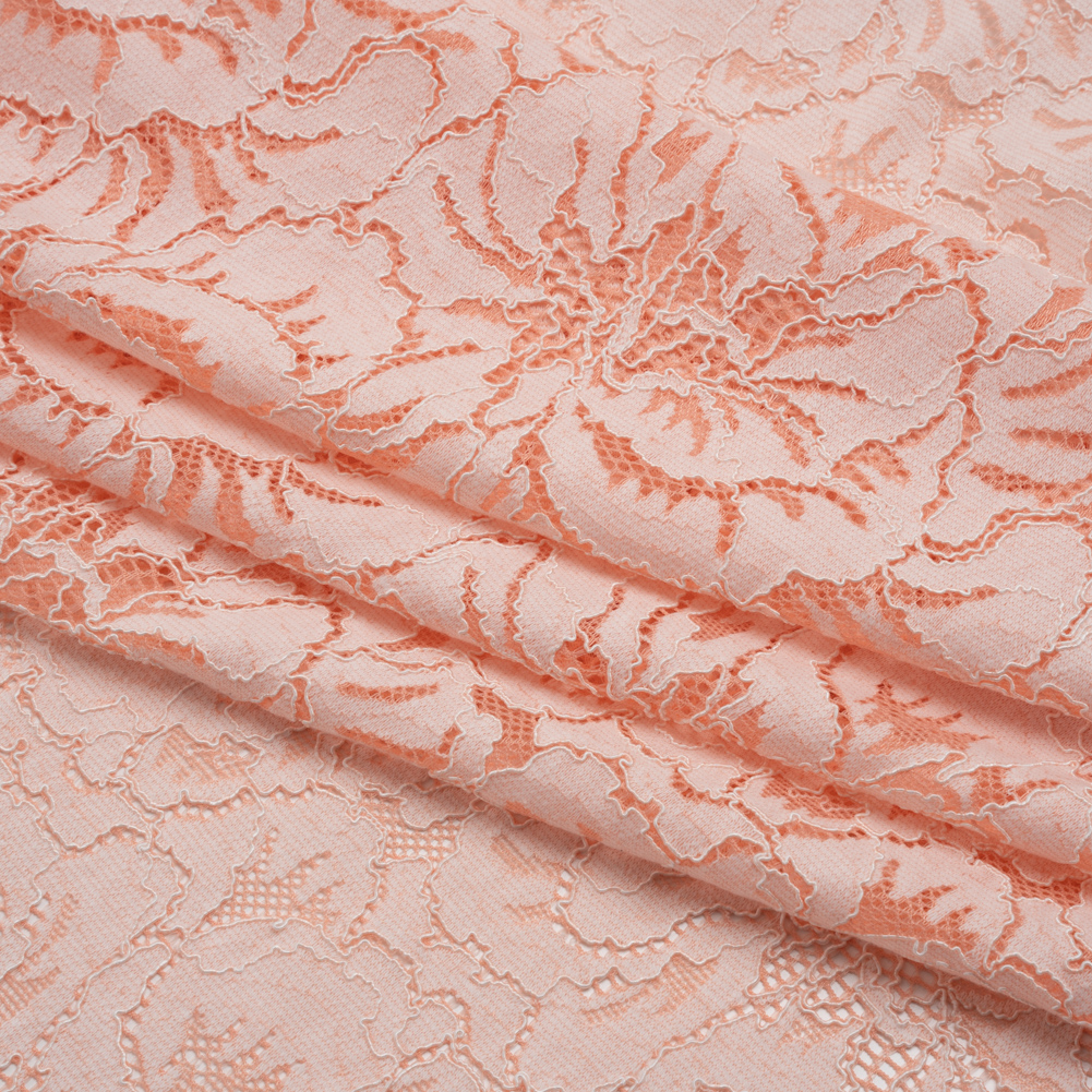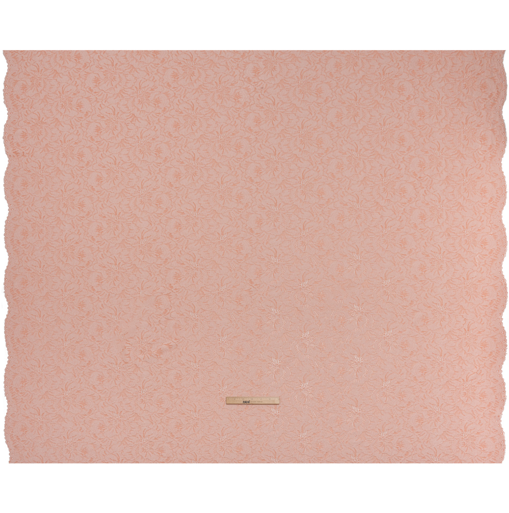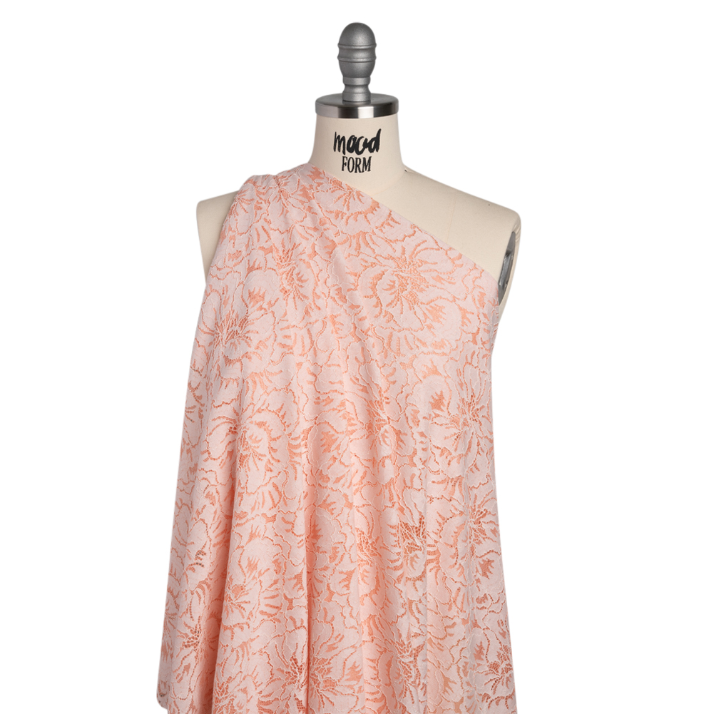 Your designs will go swimmingly with this Salmon Pink and Natural Bold Blooming Florals Stretch Corded Lace with Finished Edges—featuring a soft, tactile hand and flexible drape.Suggested Projects: Blouses, Skirts, Dresses, LingerieContent: 38% Nylon, 30% Rayon, 28% Cotton, 4% SpandexStretch: 50% WarpwiseOpacity: SheerIn a salmon pink and natural white hue, flowers bloom across this corded lace panel, complete with finished edges. This particular fabric has a soft yet tactile hand—thanks to the thin white cords running over the design—and features a fluid and flexible drape. With a moderate stretch through the warp, this lace lends itself wonderfully to bodycon and loose, flowing silhouettes alike. Use it to create elegant gowns with long trains, mock-collar blouses, flowing skirts, or some lavish lingerie. Due to the nature of lace, some portions of this fabric are open so a lining may be desired for opacity.