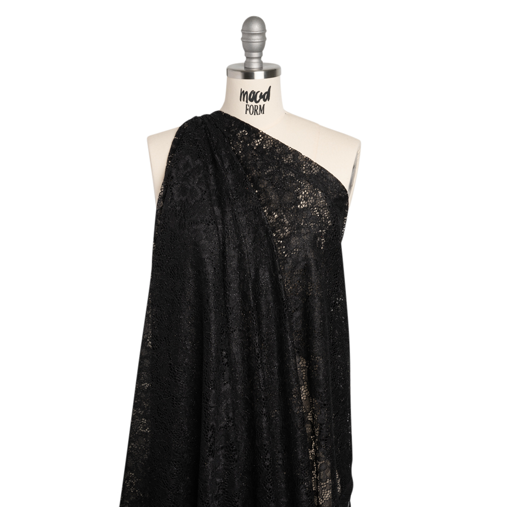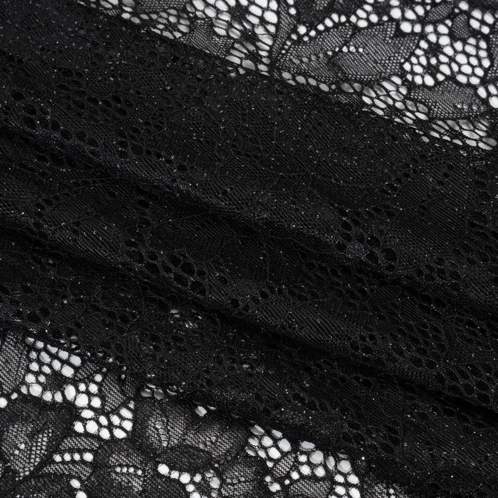 Stun the senses at black-tie events in this Black Floral Stretch Corded Raschel Lace with Black All-Over Glitter—featuring a tactile hand and fluid, malleable drape.Suggested Projects: Shirts, Dresses, Skirts, PantsContent: 88% Nylon, 12% SpandexStretch: 10% Weftwise, 25% WarpwiseOpacity: SheerThis tactile, all-over glitter lace features a shimmering floral design—blooming buds opening their petals atop a black background. A slight all-way stretch and fluid, malleable drape makes it ideal for both bodycon and flowing silhouettes. With its delicate, glimmering design we envision bodycon dresses, blouses, bellbottom pants, crop tops, and more! Sheer, use it as a panel or insert a lining for more opacity and comfort of wear.