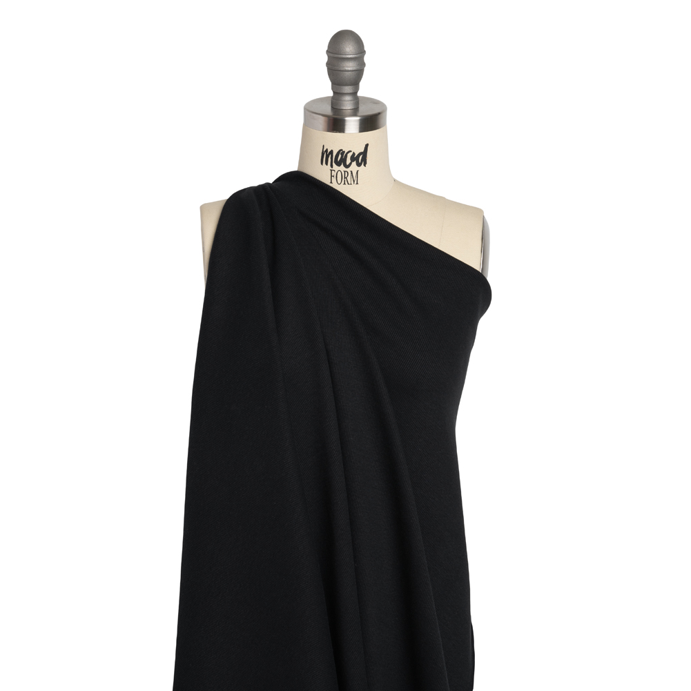For pieces that seamlessly transition from season to season, use this Black Stretch Cotton 2×2 Rib Knit, featuring a soft, tactile hand and malleable drape.