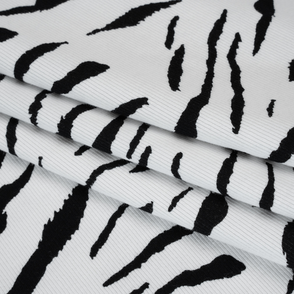 Stitch the heart of the safari into your wardrobe using this Black and White Zebra Striped Stretch Cotton 2x2 Rib Knit—featuring a lightly tactile hand and flexible drape.Suggested Projects: Tops, Shorts, Cardigans, PantsContent: 95% Cotton, 5% SpandexStretch: 50% Weftwise, 25% WarpwiseOpacity: Mostly OpaqueUnleash your wild side with this rib knit, where bold black zebra stripes prowl across a crisp white backdrop. With a moderate all-way stretch, flexible drape, and delicate 2x2 rib-knit construction, this fabric moves with you through every moment—whether it’s strutting down city streets in a sleek turtleneck, a night out in a bodycon dress, or an afternoon dance class in bell-bottom leggings. Mostly opaque but gaining translucency as it is stretched, we recommend layering over camis or slips.