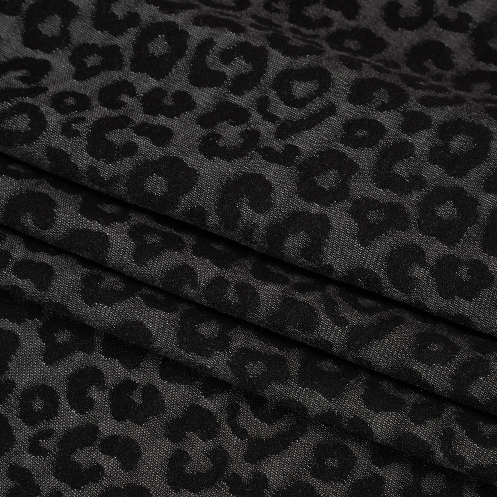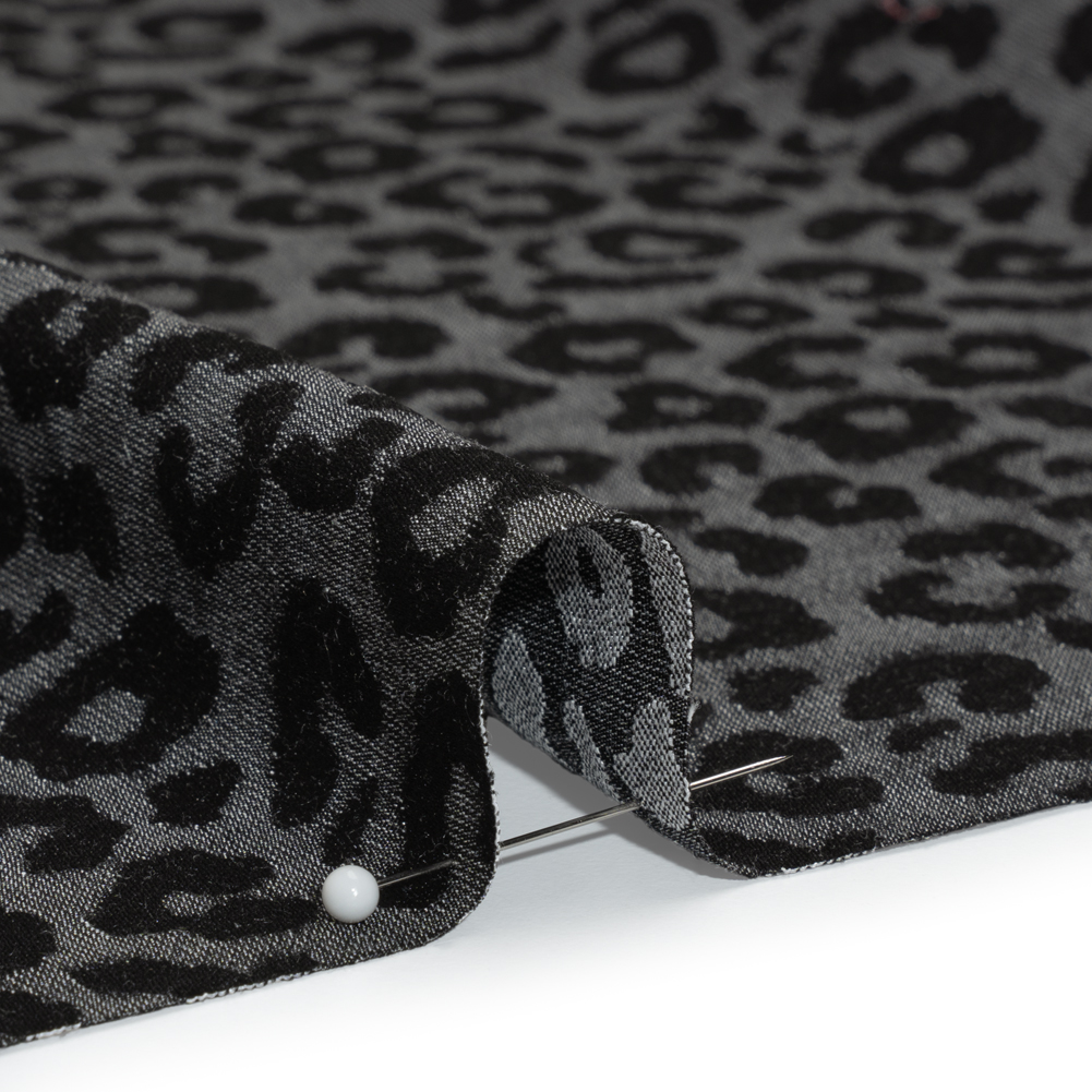 Get ready for a wild night in this Gray and Black Animal Spots Stretch Cotton and Polyester Jacquard, featuring a soft, tactile hand and malleable drape.