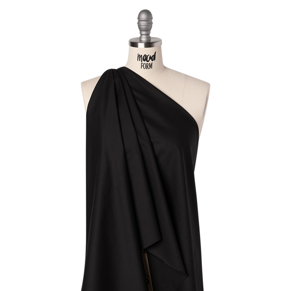 Suit up for style success with this Black Stretch Cotton and Viscose Twill by Theory, a polished staple that means business—with just enough give to keep things comfortable.Suggested Projects: Dresses, Pants, Blazers, SkirtsContent: 50&#37 Cotton, 50&#37 Viscose, 5&#37 ElastaneStretch: 10&#37 WeftwiseOpacity: Opaque With its dense weave and refined finish, this twill delivers a smooth, cool hand and a tailored drape that flatters in structured garments. A slight stretch adds ease to sharply cut blazers, crisp trousers, streamlined skirts, or sheath dresses designed to move with you. The opaque construction ensures confident coverage with no need for lining.