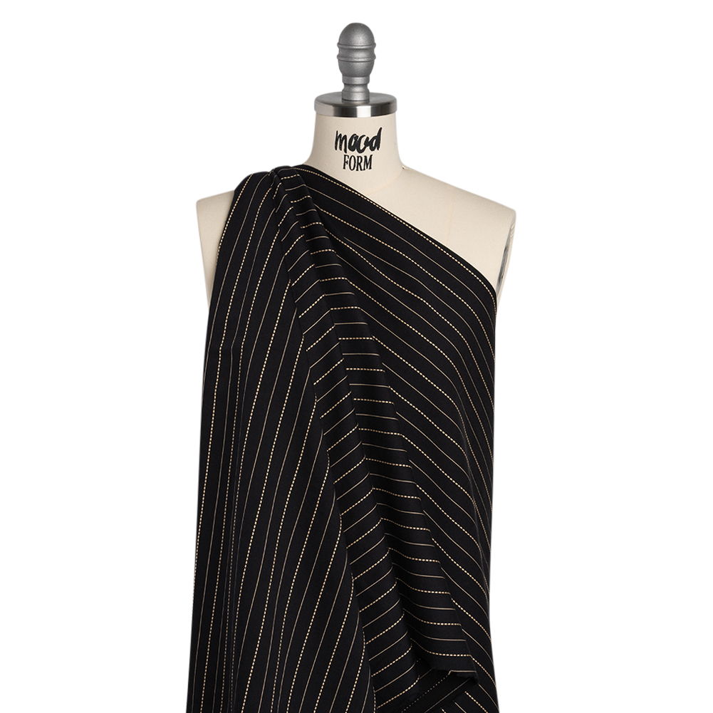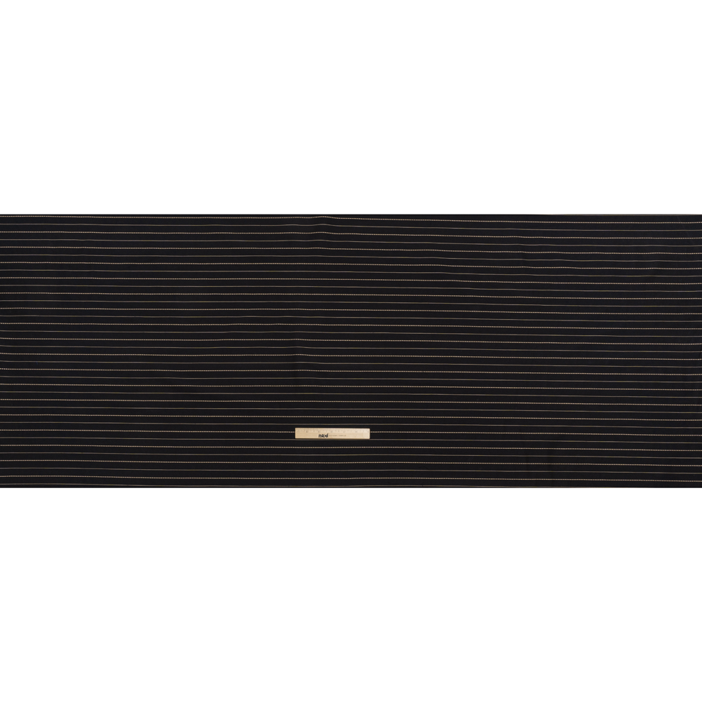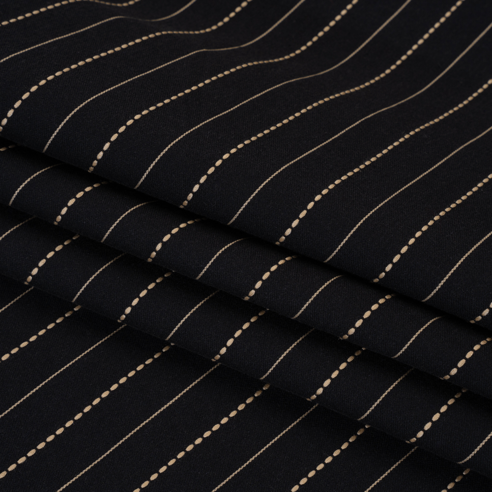 Stretch the potential of this Black and Beige Textured Stripes Stretch Cotton Blend Twill—featuring a soft, crisp hand and voluminous drape.Suggested Projects: Pants, Skirts, Dresses, JacketsContent: Cotton, Polyester, ElastaneStretch: 20% WarpwiseOpacity: OpaqueA slight stretch through the warp enhances the soft, crisp hand of this twill, elevating its rich black base and embroidered beige stripes. With a voluminous drape, it’s the perfect choice for barrel-leg pants, fun chinos, pencil skirts, structured jackets, and more. Though a lining is not needed for opacity, one may be added for a polished finish on more tailored garments.