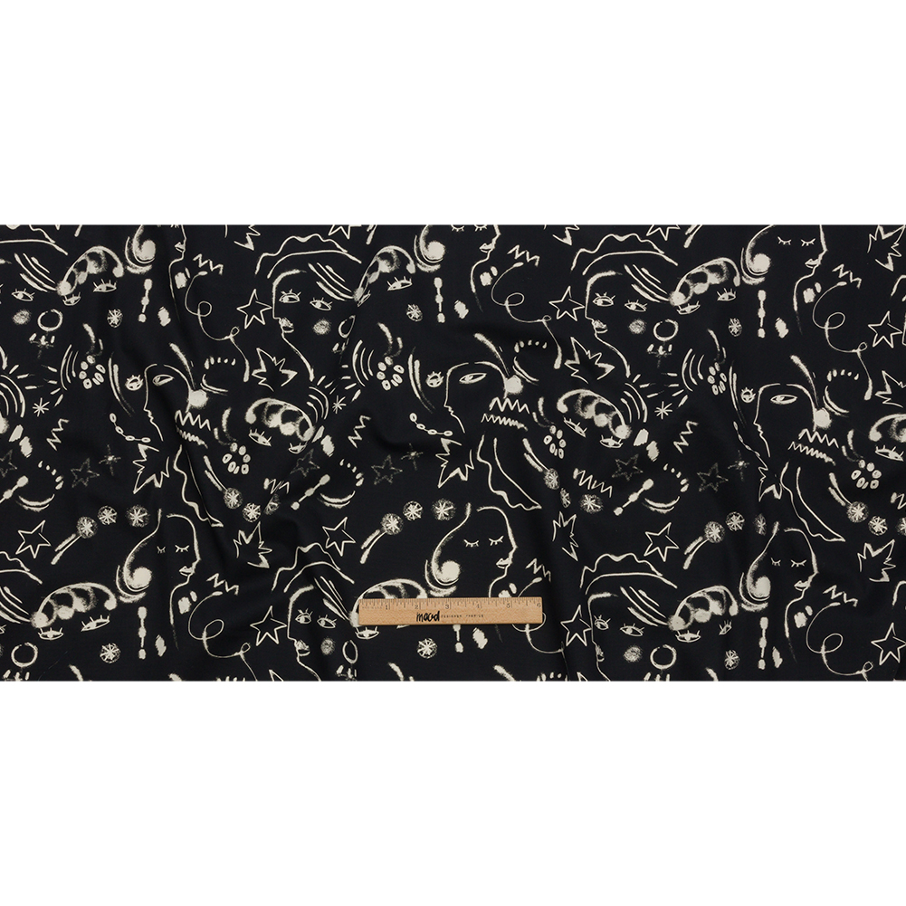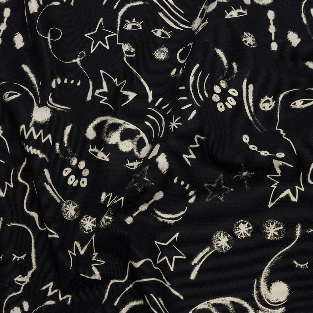 Behold the power of a line within our Mood Exclusive Universal Simplicity Stretch Cotton Canvas! Sketches and scribbles give shape to cubist faces, plants, and stars, like a page out of a frenzied sketch book.