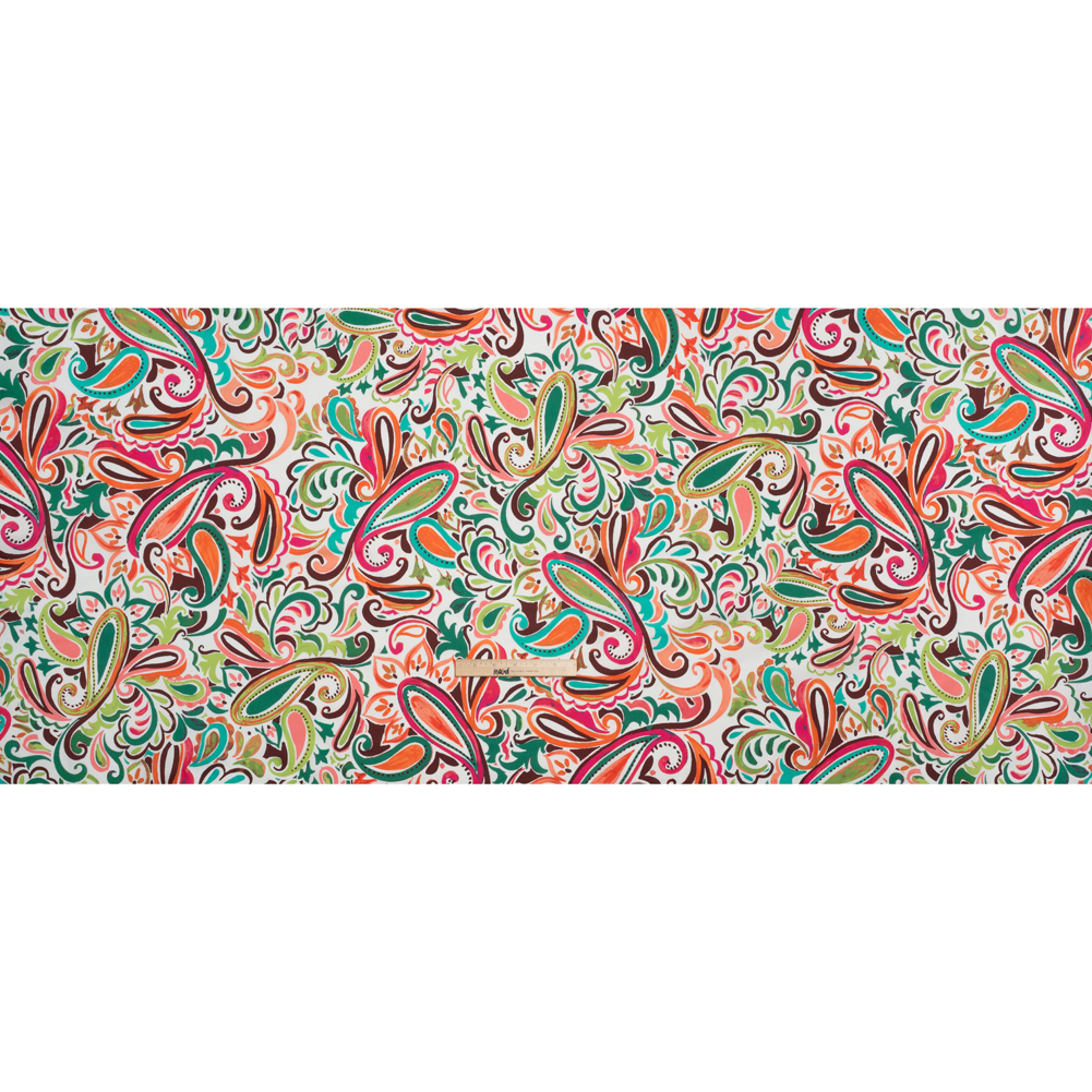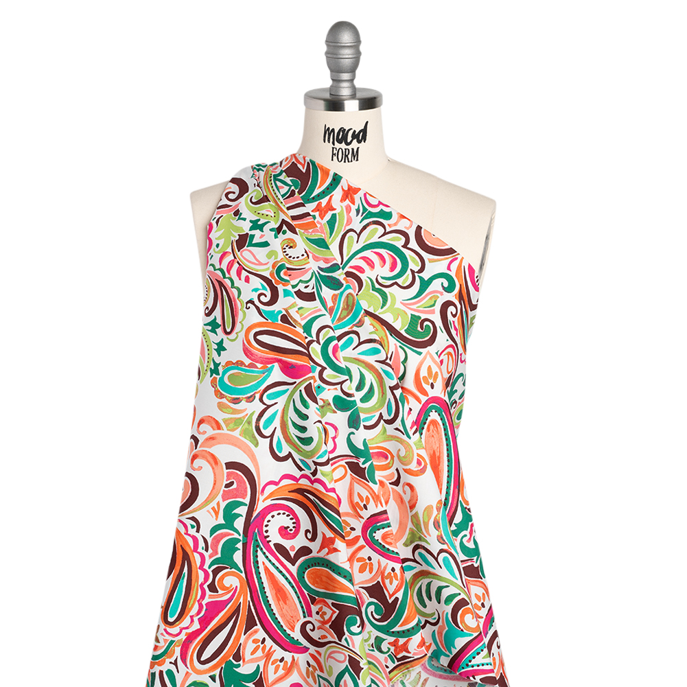 Let this Painterly Paisley Stretch Cotton Poplin paint you a picture of your next design—featuring a cool, smooth hand and crisp drape.Suggested Projects: Shirts, Skirts, Dresses, ShortsContent: 98% Cotton, 2% SpandexStretch: 20% WeftwiseOpacity: Mostly OpaqueAcross a white canvas, paisleys bloom in bold, acrylic strokes of lime green, pink, brown, teal, and orange—each one a brushstroke urging you to create. With a slight weftwise stretch, this poplin offers a cool, smooth hand and a crisp, structured drape that makes sewing a breeze and the finished look undeniably polished. Let its expressive, painterly design shine in tailored dress shirts, elegant blouses, sharp pleated skirts, or cinched shirt dresses. Mostly opaque, this fabric needs no lining for most garments, allowing your creativity to remain front and center.
