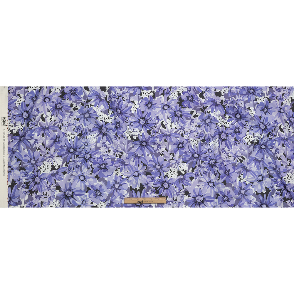 In a remote Scandinavian field, flowers bloom from the hardened soil. A symbol of the mythological Norse god, our Mood Exclusive Blue Freya's Passion Stretch Cotton Poplin celebrates the resilient grace of daisies. The painterly flowers play amongst a field of black and white splotches, clustered in different sizes. Crisp and lightweight, this poplin is a perfect fabric for sewists of all skill levels, as it is pliable and easy to drape with an added 12% widthwise stretch. Craft a wide number of garments—button-downs and blouses are just as feasible as structured sundresses, skirts, and lightweight blazers. Translucent, we recommend a lining for full opacity, if desired.