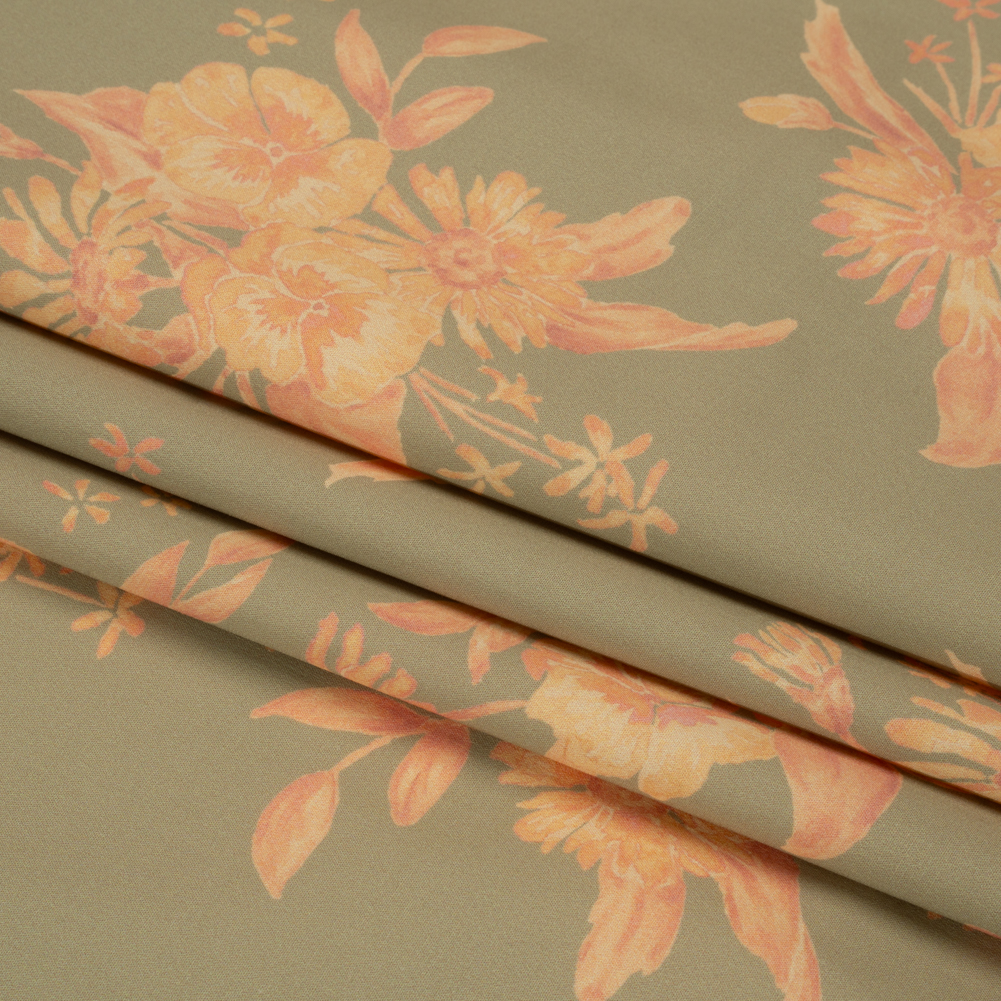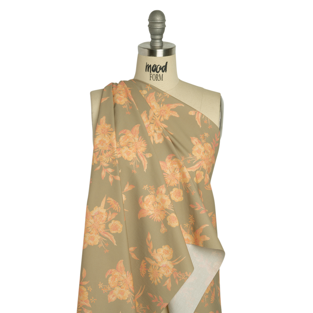 With an eye for elegance, Eleanor paints in the garden of her estate, depicting the simple beauty of flowers on our Mood Exclusive Sage Easy Eleanor Stretch Cotton Poplin. Freshly painted with peach and pink watercolors, these flowers lay in bundles against a greenish-gray background. Poplin's crisp hand and drape make it an ideal textile for shirting. Plus, with elastic combined with its cotton content, this specific poplin features a comfortable 10% weft-wise stretch that inspires wrap dresses, chinos, and more. Enjoy its moisture absorption and lightweight qualities in all temperatures and events, from summer errands to winter brunches!Please Note: The dye lot of this fabric has changed as of June 2025. If you had previously ordered this material, please order a swatch to ensure the new dye lot meets your color requirements.
