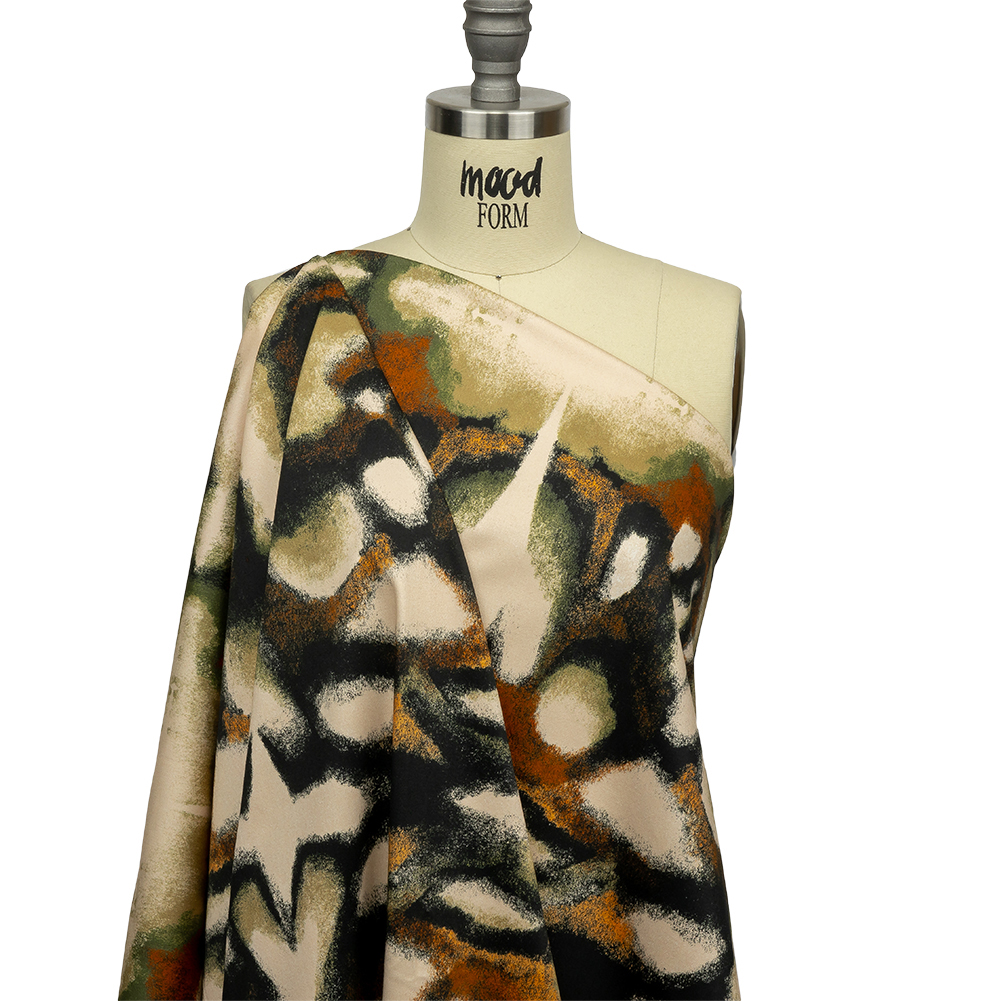 A dappled pattern of deep shadows and golden sunlight appears through the thinning leaves, casting abstractions that almost seem to be alive. Our Mood Exclusive From the Earth Stretch Cotton Sateen seems to emerge from the ground in a kaleidoscopic pattern of black, orange, rust, and olive on a cream ground. Crisp and malleable in drape, cotton sateen is prized for its breathability and wrinkle-resistant qualities. Part of The Rockland Collection, this particular variety is smooth and soft in hand, with a subtle sheen and 10% stretch through the weft. The sewing possibilities are endless; try trousers, dresses, jackets, or structured tops. Swing by our Mood Sewciety Blog to take a glance at over 300 free sewing patterns for more inspiration. For cotton sateen, we recommend the Taro Jumper, Liv Pants, and Avelia Bomber.MoodEarth Verified: BCI, or Better Cotton Initiative, focuses on the exchange of good practices, including economic, environmental, and social concerns, in the production of cotton. For more information on Mood's sustainability initiatives, check out MoodEarth here.