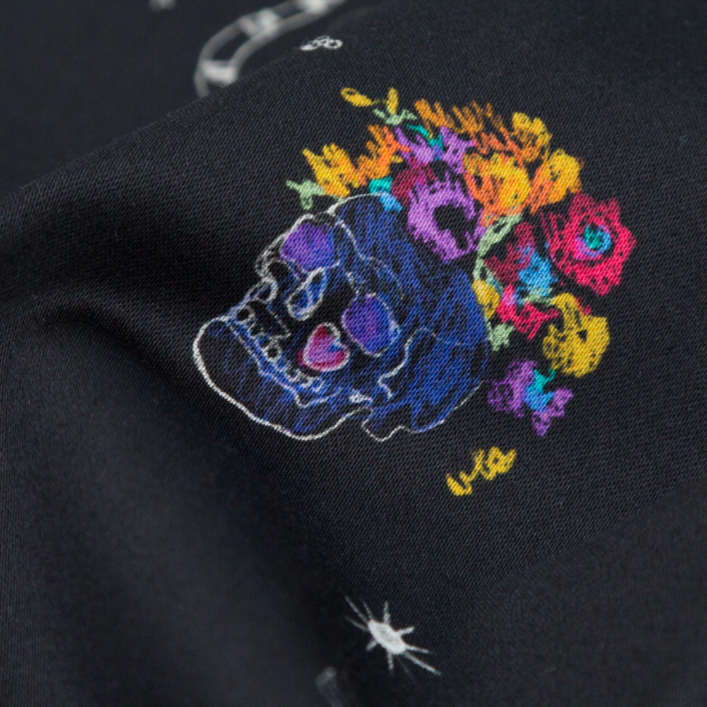 Nothing is just black and white, and our Lover's Farewell Stretch Cotton Sateen is no exception! Perfect for creating eye-catching dresses, trousers, and tops that feel as fabulous as they look.Suggested Projects: Pants, Skirts, Unconventional Suitings, DressesContent: 97% Cotton, 3% ElastaneStretch: 10% WeftwiseOpacity: OpaqueHaving a knack for drawing perspiration away from the body along with breathable and anti-static qualities, expect to fall in love! As an asset to our Crow Collection, the digitally printed pattern evokes a whimsical and potentially spooky narrative: A lively array of vibrant skulls adorned with heart tattoos and flowers, pointed arrows, snakes, crescent moons, prismatic gems, breezy palms, flying birds, detached hands, a playful "bang bang" next to a cartoon gun. Crafted with a satin weave structure, this fabric blends spun staple fibers with elastomeric fibers, offering a crosswise stretch of approximately 10%. The weave, employing a "four threads over, one thread under" pattern, enhances its smooth surface and subtle luster, akin to a twill weave but without the diagonal ridge. Ideal for fashion garments and lightweight home decor, this versatile fabric drapes crisply. From tight-fitted blouses to flowing peplum dresses, and even bedding like sheets and pillowcases, it invites endless creative possibilities.