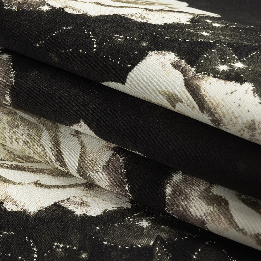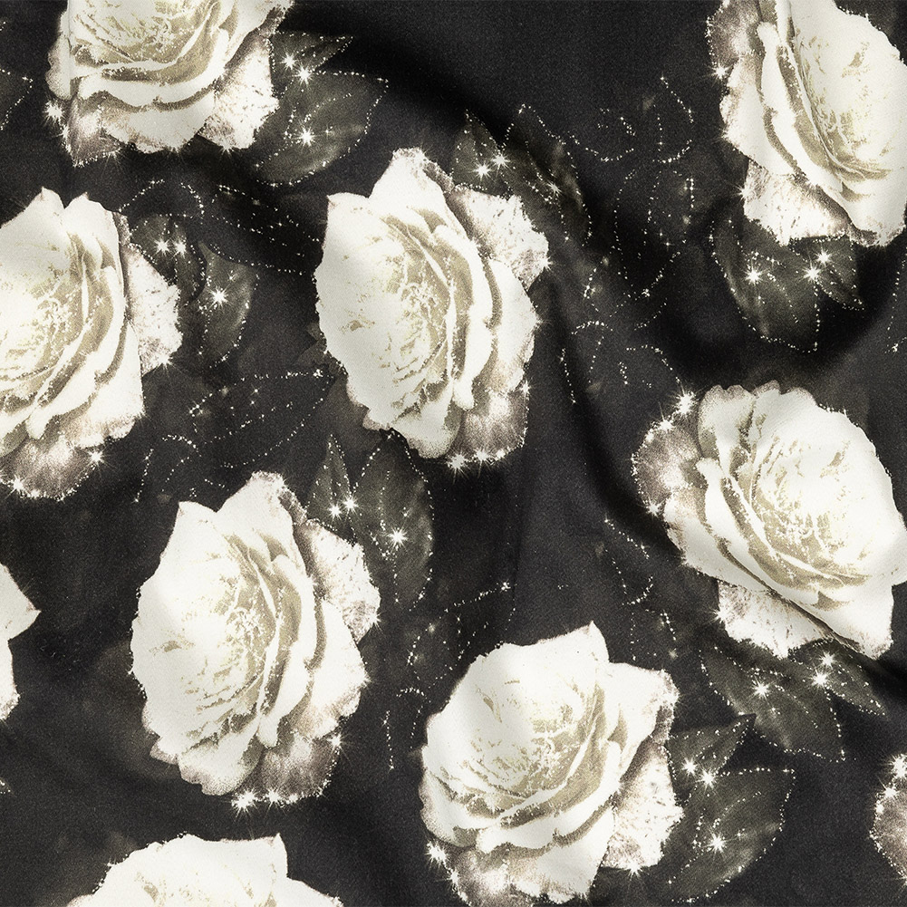 Stretch Cotton Sateen - Black and White Starry Floral - Rose Dread Print - Mood Exclusive Twilight Collection