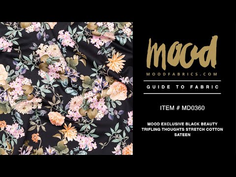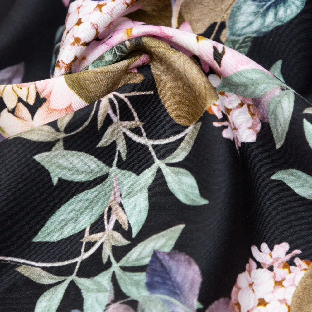 “To while away the idle hours…”, our Mood Exclusive Black Beauty Trifling Thoughts Stretch Cotton Sateen excites leisurely fashion! From the Mood Exclusive Kenko Collection: Crisp with a soft, gummy feel, this medium-weight wonder expresses a dull sheen across its digitally-printed facing. Lively arrangements of enthused floral motifs span across a faded-black backdrop, composing a surreal scene; and as “...the sight sinks deeply into one's being... one feels ‘Oh! for a friend with whom to share this!'”. And, who wouldn't want to share this gem? With its anti-static make-up, breathability, knack for drawing perspiration away from the body, and wrinkle-resistant surface, it is quite the dream! Specially constructed with a satin weave, twisted staple fibers combine with elastomeric fibers—producing a crosswise stretch of about 10%—while weft yarns floating over (at least four) warp yarns create a hint of luster and smooth surface, (overall similar to a twill weave without yielding a diagonal ridge). “...being pleasing to the eye and at the same time useful for all sorts of purposes…” translate this stunning beauty into countless silhouettes—taking inspiration from its semi-stiff, flexible drape (and the poetic writings of Yoshida Kenko!): Sew together body-hugging looks such as a blouse or sheath dress with a billowing peplum, high-waisted wide leg trousers, shirt dresses, and more! Also great for A-line garments, check out The Cypress Dress free sewing pattern (made from cotton sateen!) offered on our Mood Sewciety blog. Opaque, a lining is not of necessity.