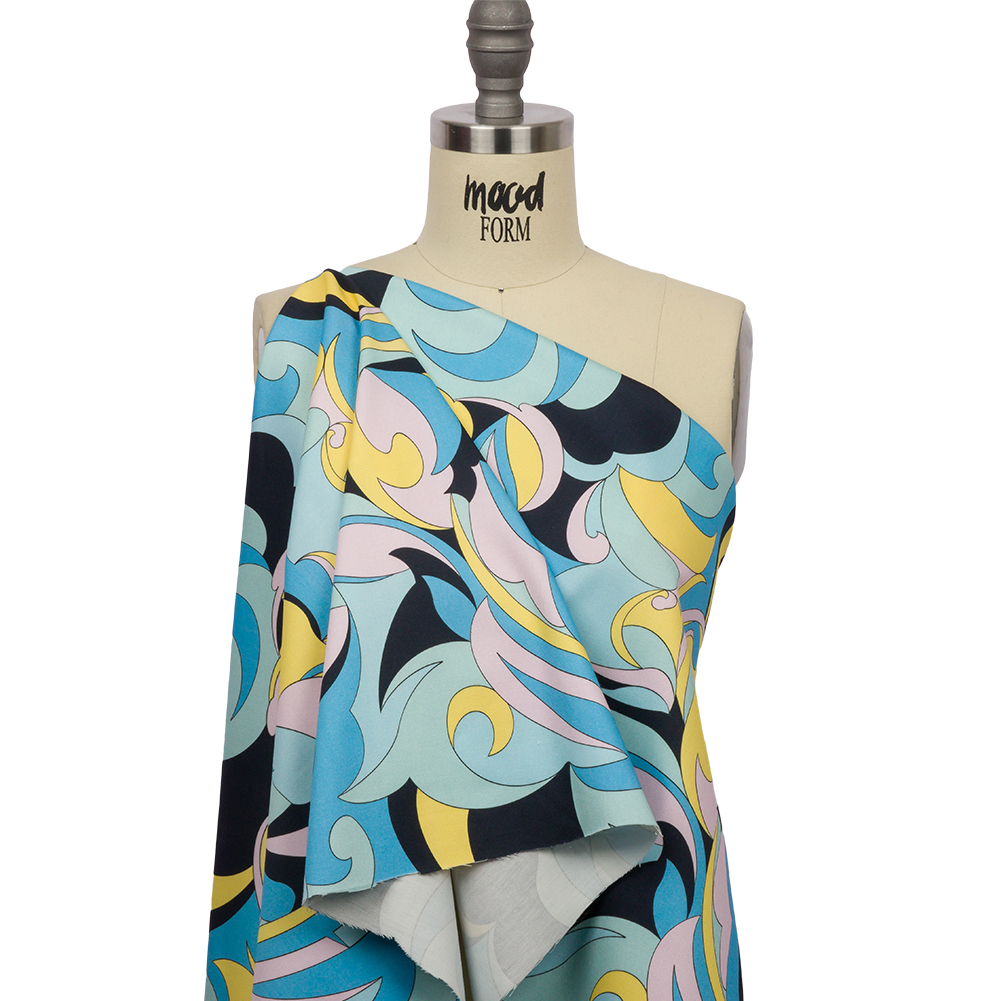 Embrace the unknown and adventure into the smoky swirls of this Mood Exclusive Blue Magical Mystery Stretch Cotton Sateen. Black, pink, and yellow add a sharper edge to swirling cloud-like shapes enchanted with blue and green hues. Flexible in drape, cotton sateen is prized for its breathable nature. Part of The Groove Collection, this particular variety is smooth and soft in hand, with a subtle sheen and 10% stretch through the weft. The sewing possibilities are endless; try trousers, dresses, jackets, or structured tops. Swing by our Mood Sewciety Blog to take a glance at over 300 free sewing patterns for more inspiration. For cotton sateen, we recommend the Taro Jumper, Liv Pants, and Avelia Bomber.MoodEarth Verified: BCI, or Better Cotton Initiative, focuses on the exchange of good practices, including economic, environmental, and social concerns, in the production of cotton. For more information on Mood's sustainability initiatives, check out MoodEarth here.