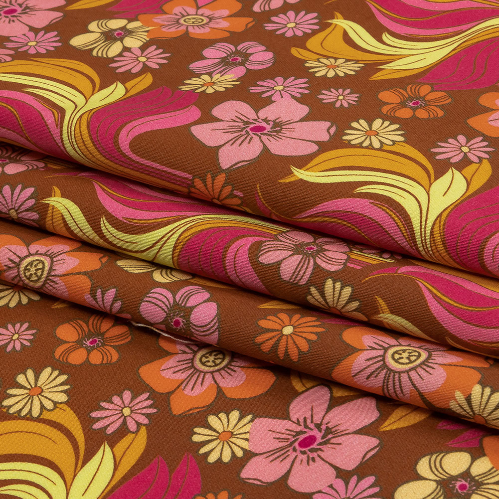 Find some peace as blossoms rain down upon you from this Mood Exclusive Brown Flower Shower Stretch Cotton Sateen! Tranquility and good vibes abound among brilliant pink and yellow florals, atop a warm brown ground. Flexible in drape, cotton sateen is prized for its breathable nature. Part of The Groove Collection, this particular variety is smooth and soft in hand, with a subtle sheen and 10% stretch through the weft. The sewing possibilities are endless; try trousers, dresses, jackets, or structured tops. Swing by our Mood Sewciety Blog to take a glance at over 300 free sewing patterns for more inspiration. For cotton sateen, we recommend the Taro Jumper, Liv Pants, and Avelia Bomber.MoodEarth Verified: BCI, or Better Cotton Initiative, focuses on the exchange of good practices, including economic, environmental, and social concerns, in the production of cotton. For more information on Mood's sustainability initiatives, check out MoodEarth here.