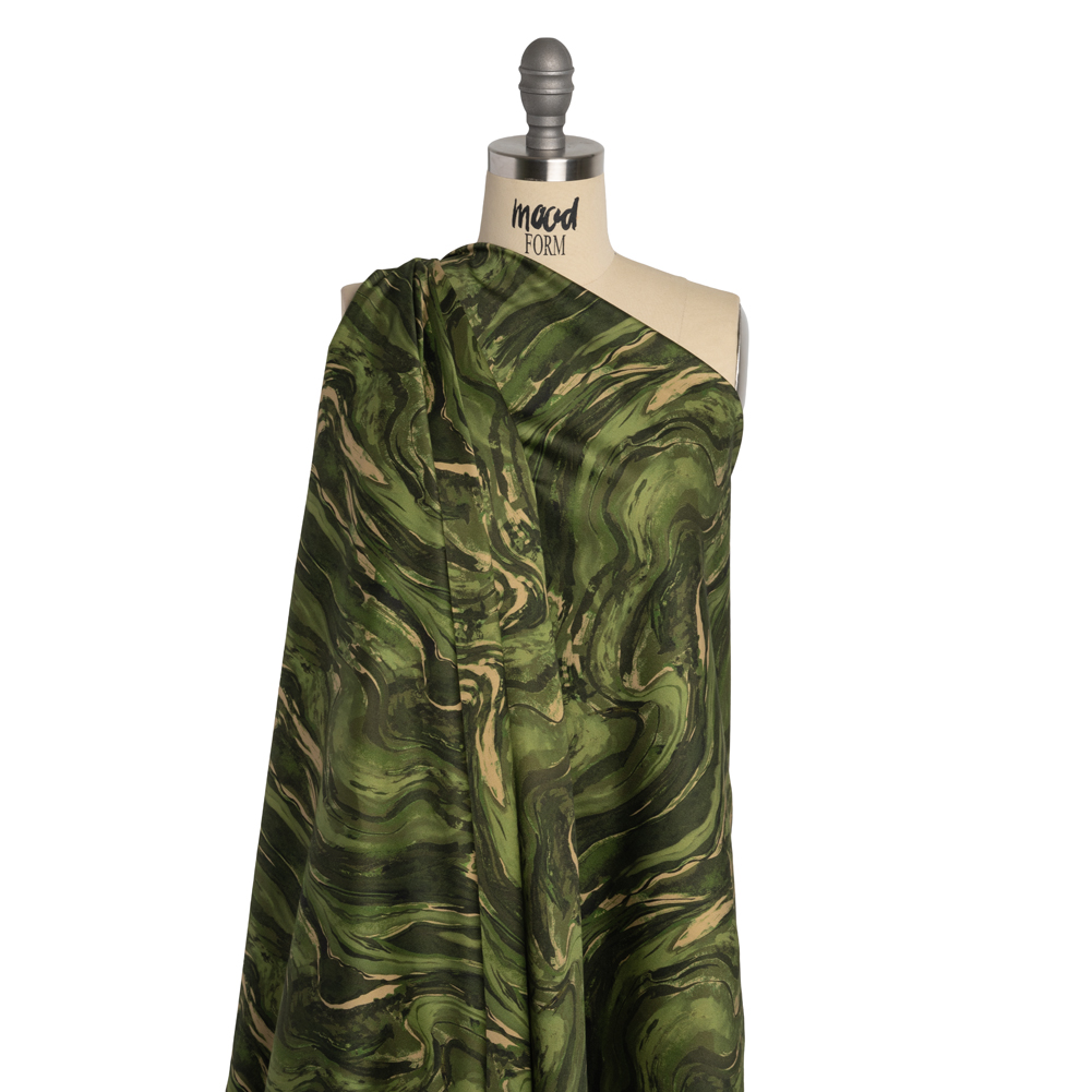 Stretch Cotton Sateen - Green and Beige Abstract Swirls - Painter’s Pond Print - Mood Exclusive Acadia Collection