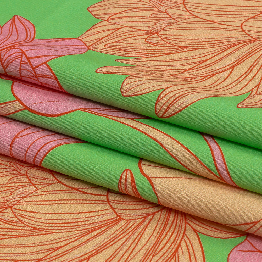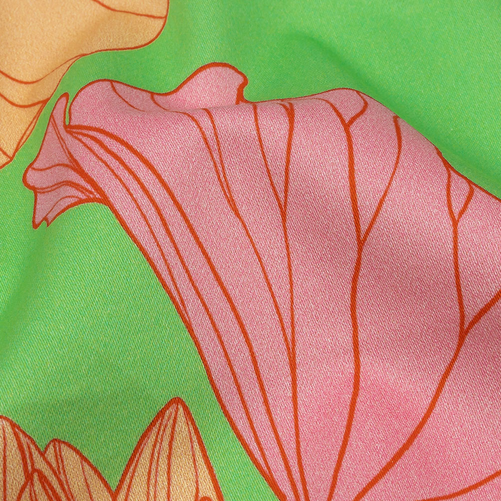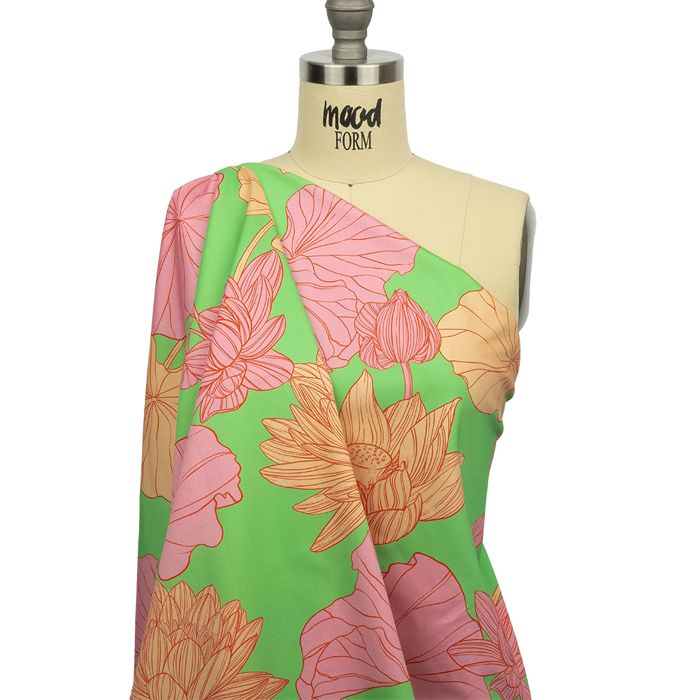 Take a trip through this Mood Exclusive Lime Valley of Lilies Stretch Cotton Sateen. Finely lined lilies in pink and pale orange drift across a lime green ground, daring you to adventure into their world. Flexible in drape, cotton sateen is prized for its breathable nature. Part of The Groove Collection, this particular variety is smooth and soft in hand, with a subtle sheen and 10% stretch through the weft. The sewing possibilities are endless; try trousers, dresses, jackets, or structured tops. Swing by our Mood Sewciety Blog to take a glance at over 300 free sewing patterns for more inspiration. For cotton sateen, we recommend the Taro Jumper, Liv Pants, and Avelia Bomber.MoodEarth Verified: BCI, or Better Cotton Initiative, focuses on the exchange of good practices, including economic, environmental, and social concerns, in the production of cotton. For more information on Mood's sustainability initiatives, check out MoodEarth here.