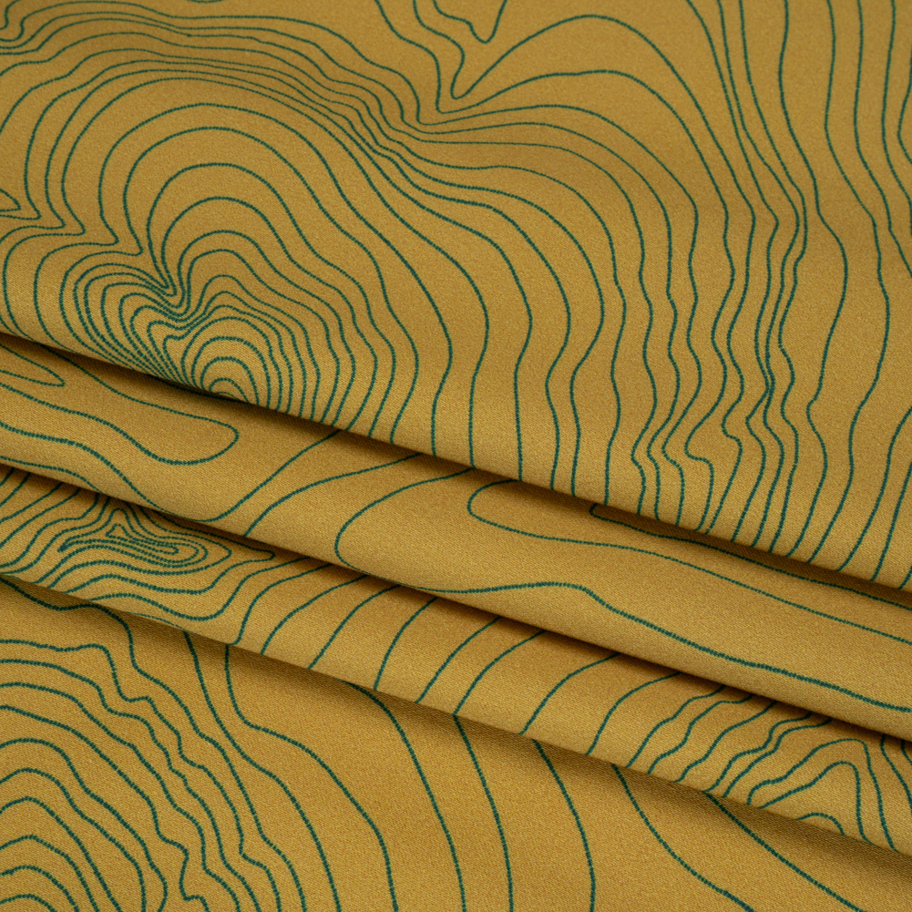 You’re sure to find endless inspiration if you follow this Topographic Map Stretch Cotton Sateen, featuring a slight weftwise stretch, malleable drape, and cool hand thanks to its stretch cotton content—perfect for stunning spring and summer styles.Suggested Projects: Pants, Dresses, Tops, JacketsContent: 97% Cotton 3% ElastaneStretch: 10% WeftwiseOpacity: OpaqueA landscape of mountains, hills, and valleys unfolds across this stretch cotton sateen, where fine hunter green lines trace the paths of adventures yet to come, mapping trails to be hiked and landmarks to be discovered against a backdrop of muted mustard yellow—evoking the warm embrace of sunlit terrain. Malleable and slightly crisp in drape, cotton sateen is prized for its breathable nature. Part of The Acadia Collection, this particular variety is cool and crisp in hand with a 10% stretch through the weft. In saturated nature-inspired shades, the sewing possibilities are endless; try fit-and-flare trousers, brilliant blazers, and shift dresses.