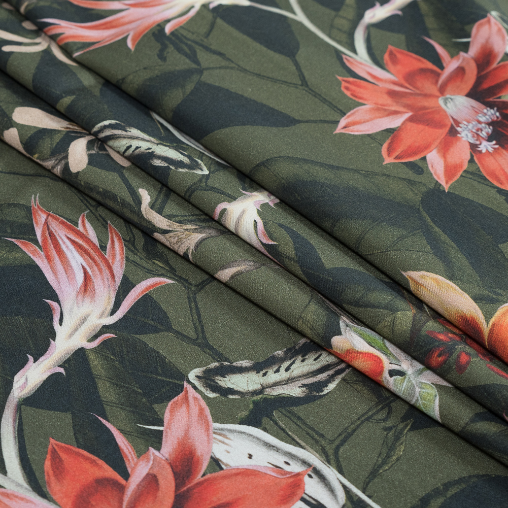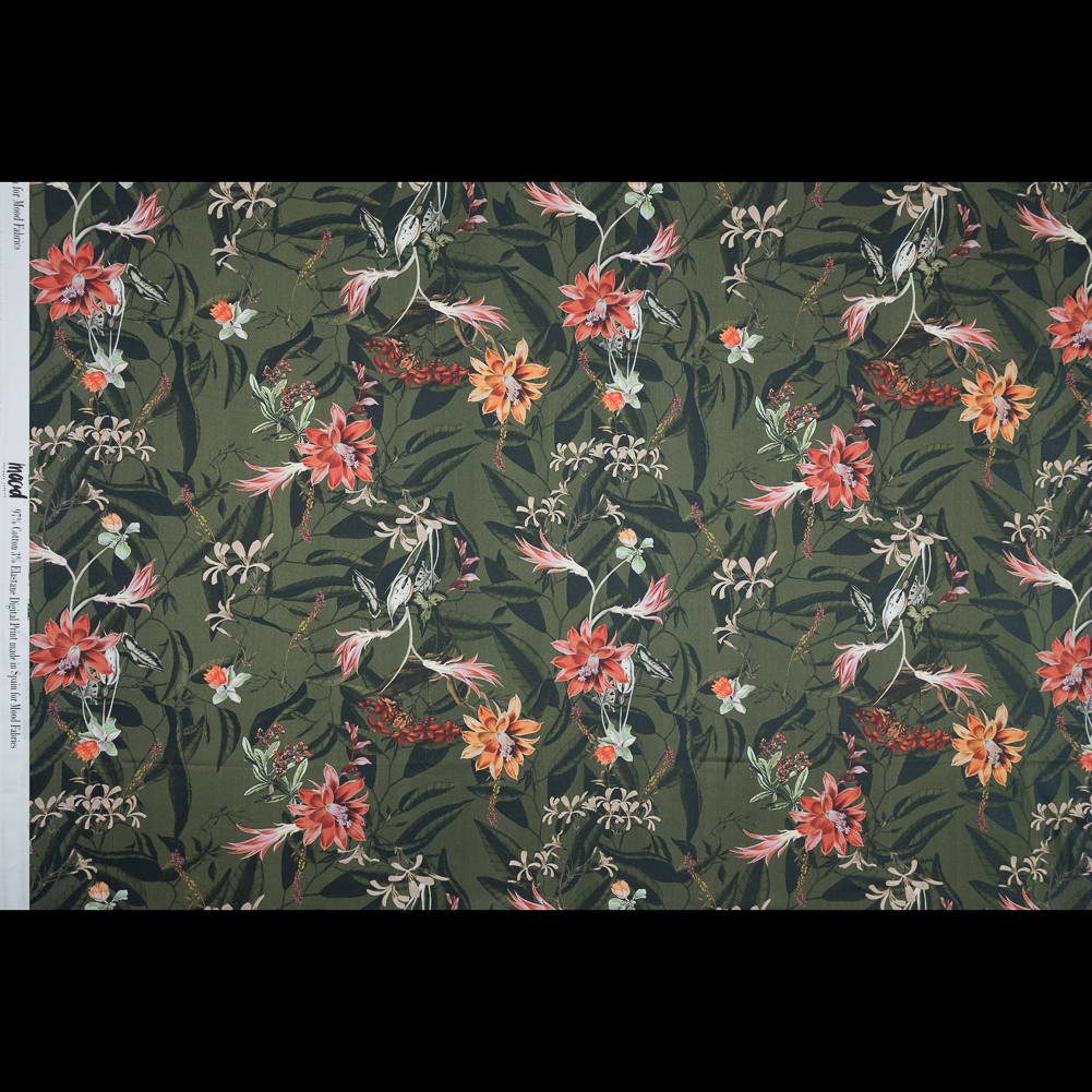 Explore a tropical paradise with our Mood Exclusive Les Tropiques Olive Green Stretch Cotton Sateen.