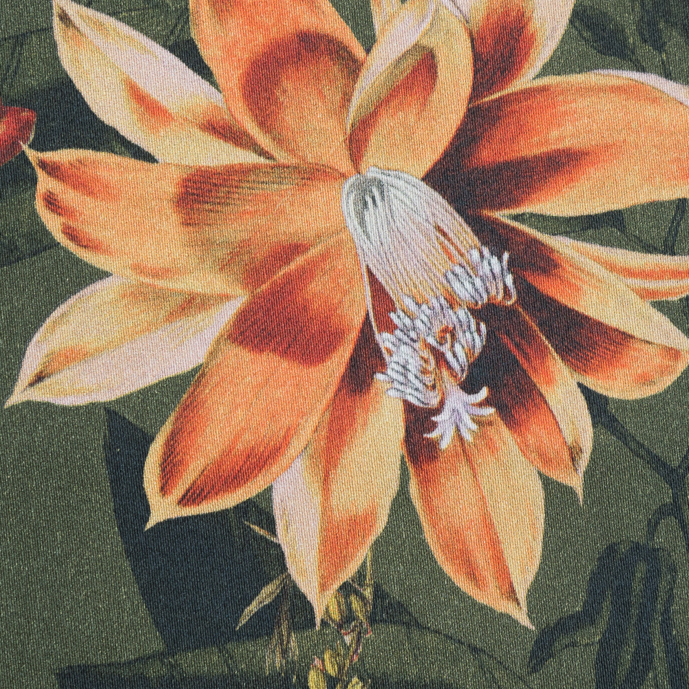 Explore a tropical paradise with our Mood Exclusive Les Tropiques Olive Green Stretch Cotton Sateen. Vibrant orange and pink flowers bloom from their olive green foliage backdrop in a detailed digitally printed design. Entitled Les Tropiques, which translates to "the tropics", this print has us reminiscing of relaxing vacations in the tropics, lounging on the beach under the shade of palm trees that reach towards the island sun. Its luxuriously smooth hand and subtle sheen was made in Spain and consists of cotton. Breathable and thin, its medium weight creates a flexible drape that may be used in creating stunning silhouettes. We see backless tea-length dresses, midi skirts and A-line tops for the spring and summer season. A stretch through the weft ensures comfort, so you can feel as chic as you look. Translucent, insert a lining for more opacity.