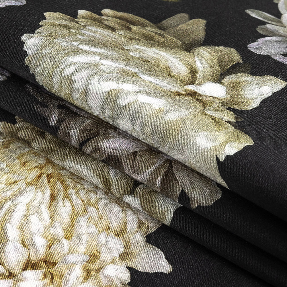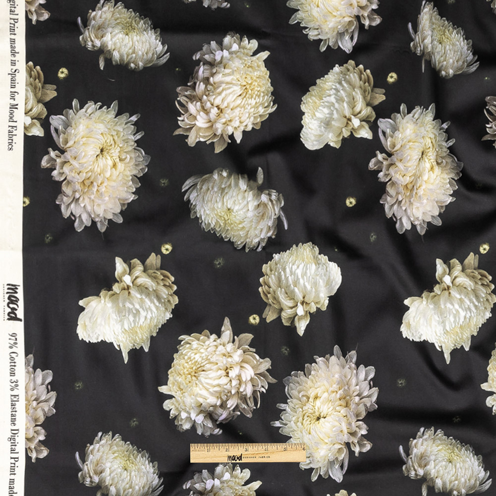 A woman cries in a garden, cold rain and sharp wind pierce her thin dress, but is she real? Is she alive? Our Mood Exclusive Maiden's Melancholy Stretch Cotton Sateen features pale yellow chrysanthemums blooming, ghostly light, against a dark ground, an homage to sad spirits haunting things that should not be haunted. A spectral component of The Twilight Collection, this adaptable sateen offers great breathability and wrinkle-resistant qualities. Soft and smooth in hand, its medium weight construction offers a 10% stretch through the weft. With a slightly crisp, malleable drape, create delightful shift dresses, voluminous wrap skirts, and casual surplice blouses. Swing by our Mood Sewciety Blog to take a glance at our free Lantana Maxi Shirt, Daylily Skirt, Cypress Dress, Nepeta Blazer, Nymania Pants, Dogwood Ensemble and Ulmus Dress sewing patterns for more inspiration.